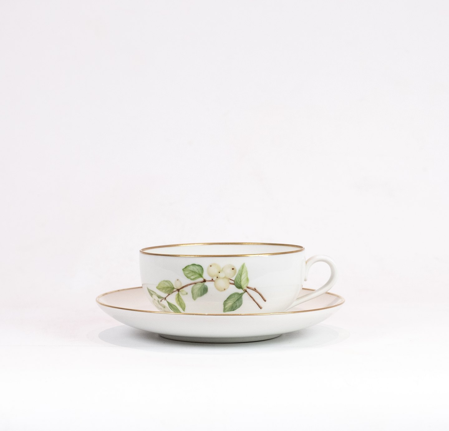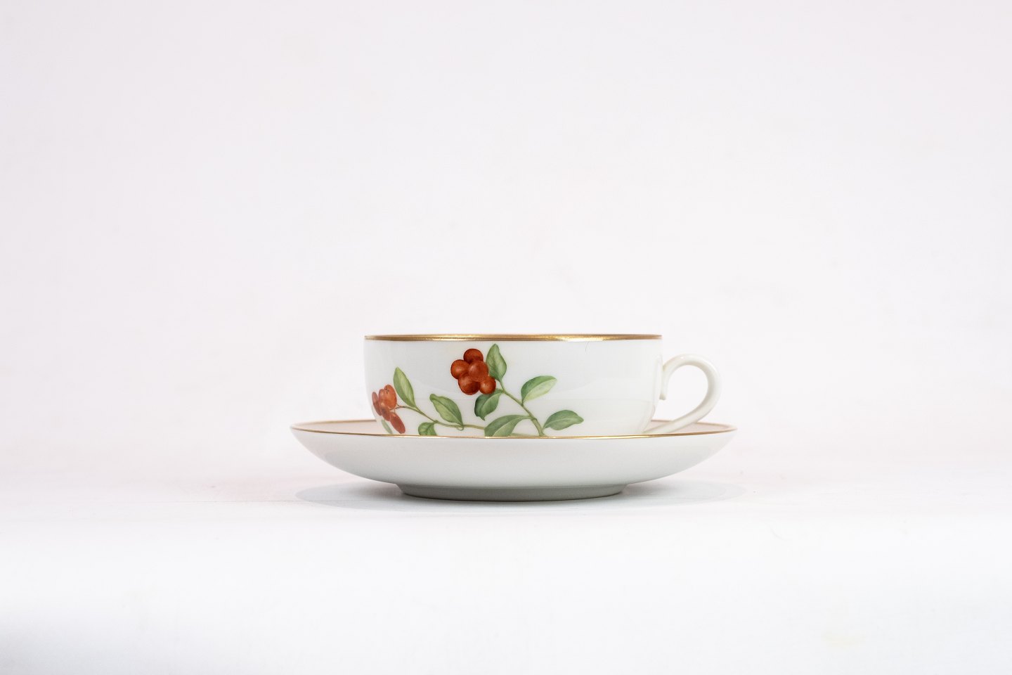 Porcelain tea cups with saucer decorated with different floral motives, no.: 108, by Bing and Grøndahl. Ask for number in stock. Price is per cup/saucer.