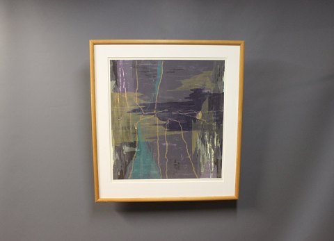 Høj bordlampe i poleret messing med flot udsmykket trefod fra 1920erne. Skærmen er håndmalet og håndfoldet i papir.