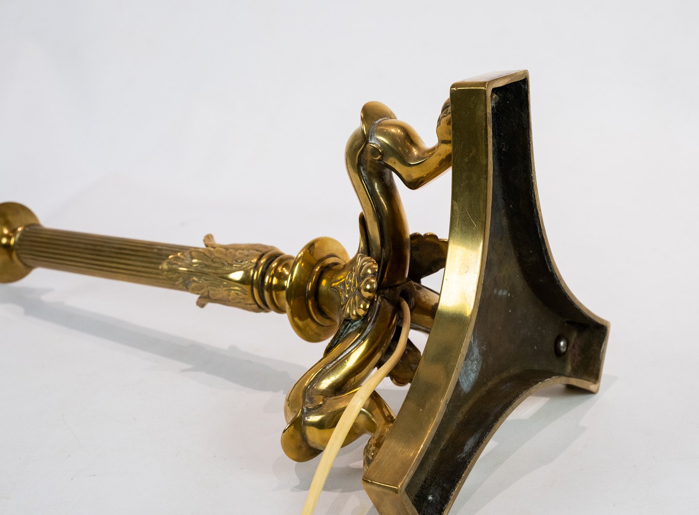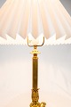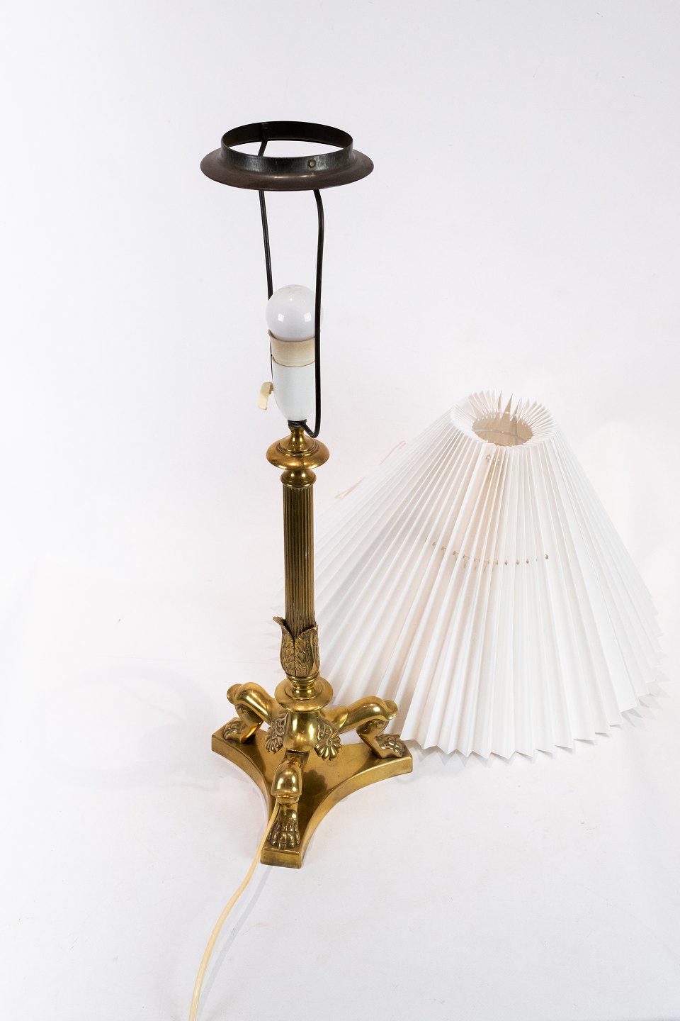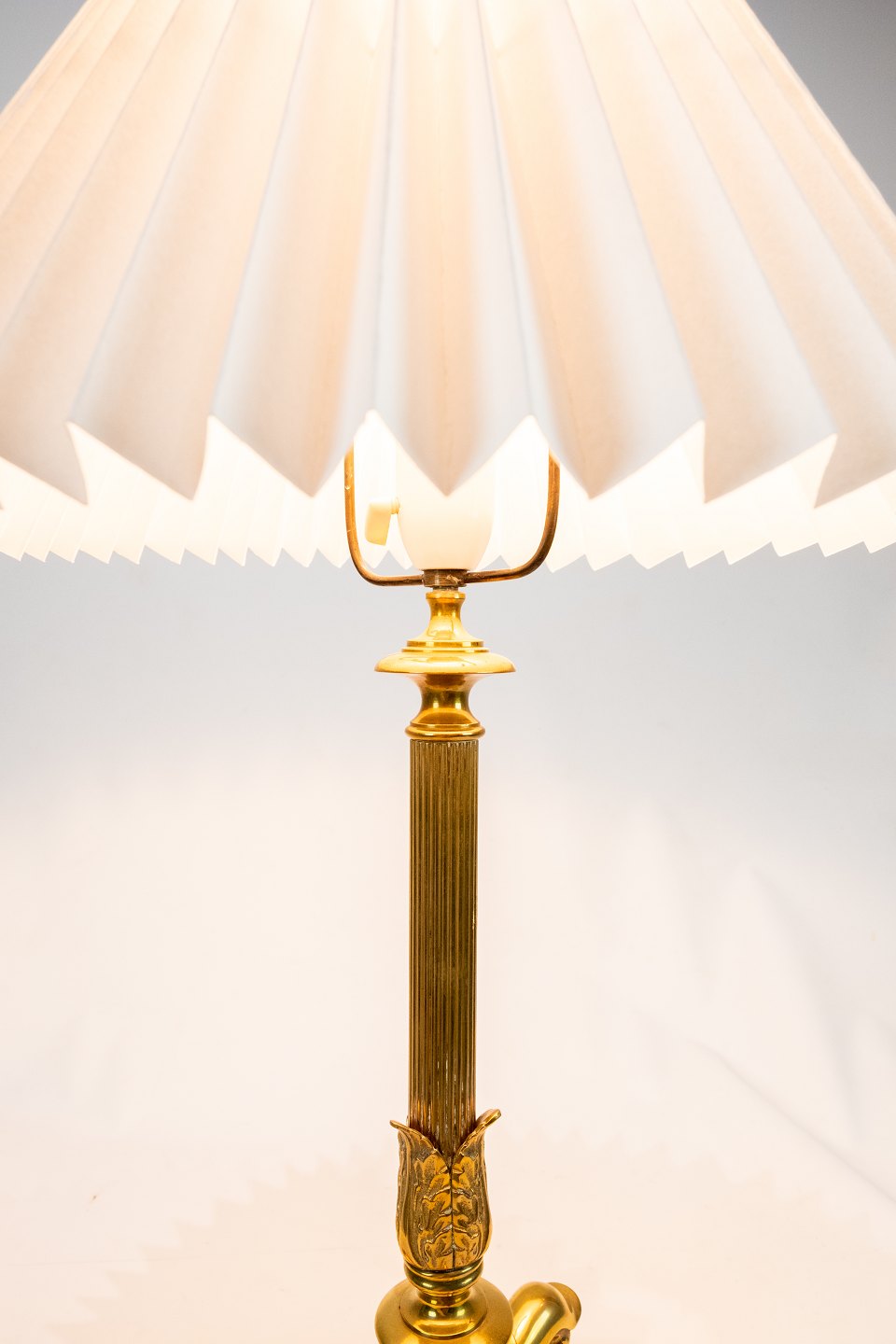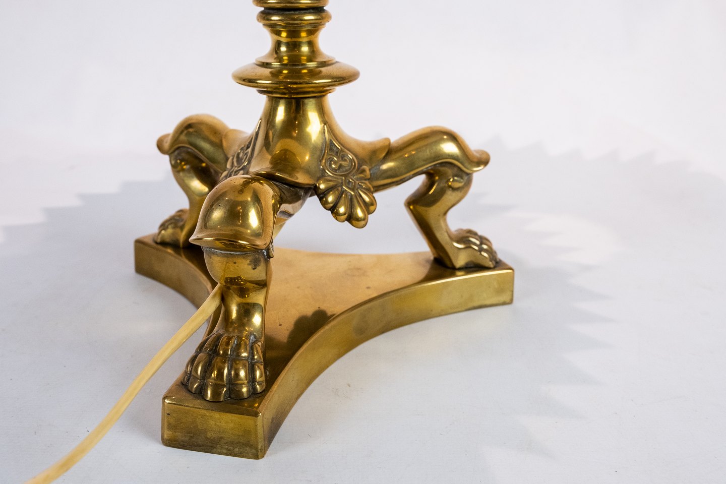 Høj bordlampe i poleret messing med flot udsmykket trefod fra 1920erne.