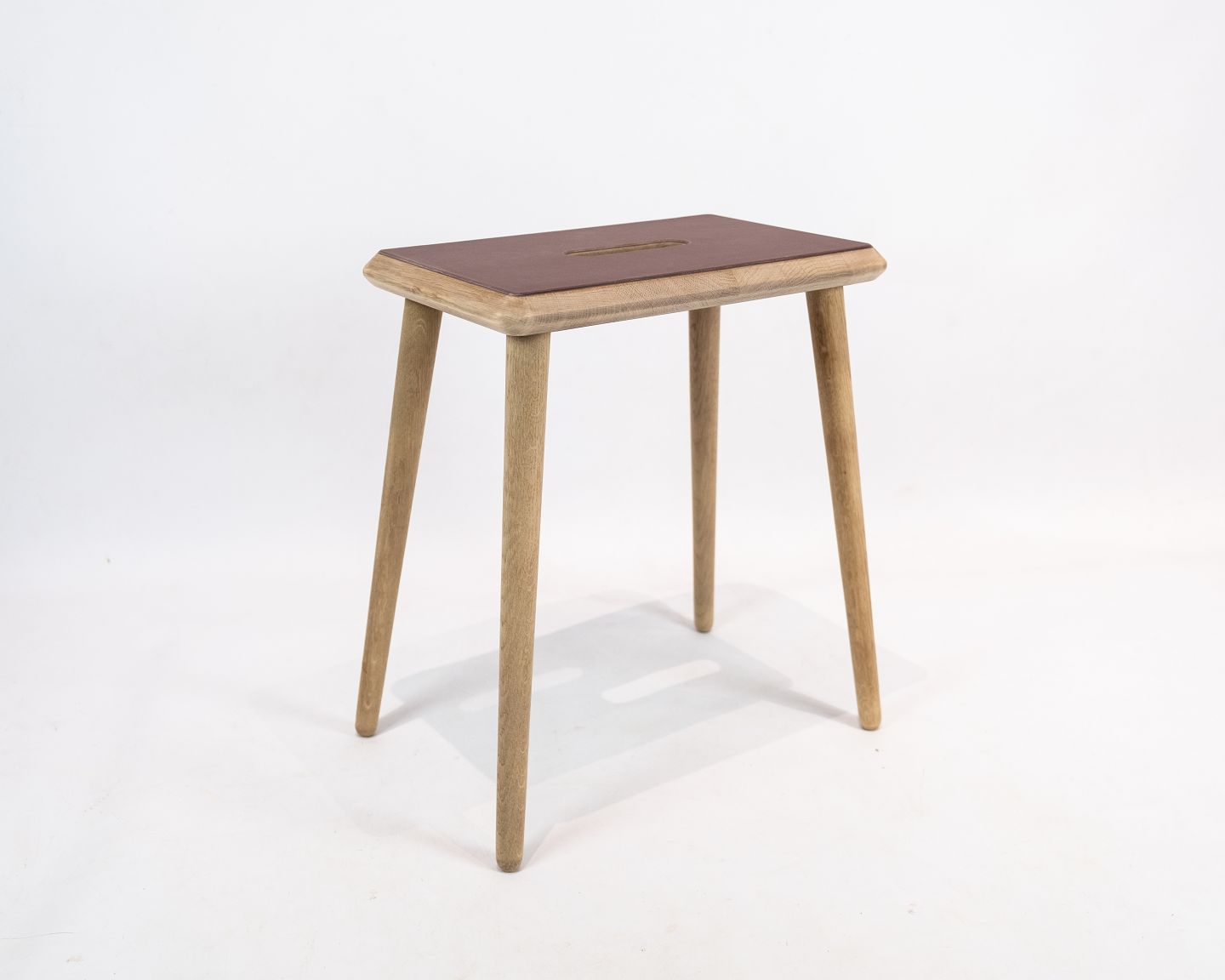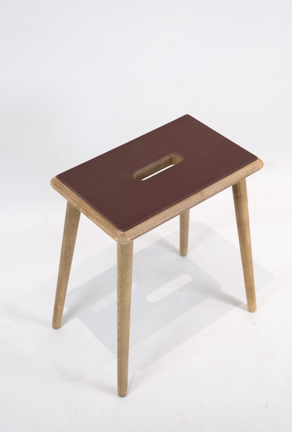 This stool with a brown laminate top and oak legs is a stylish and functional accessory for any home. Produced by Via Copenhagen, a Danish company known for their focus on quality and craftsmanship, this stool offers a perfect balance between aesthetics and functionality.