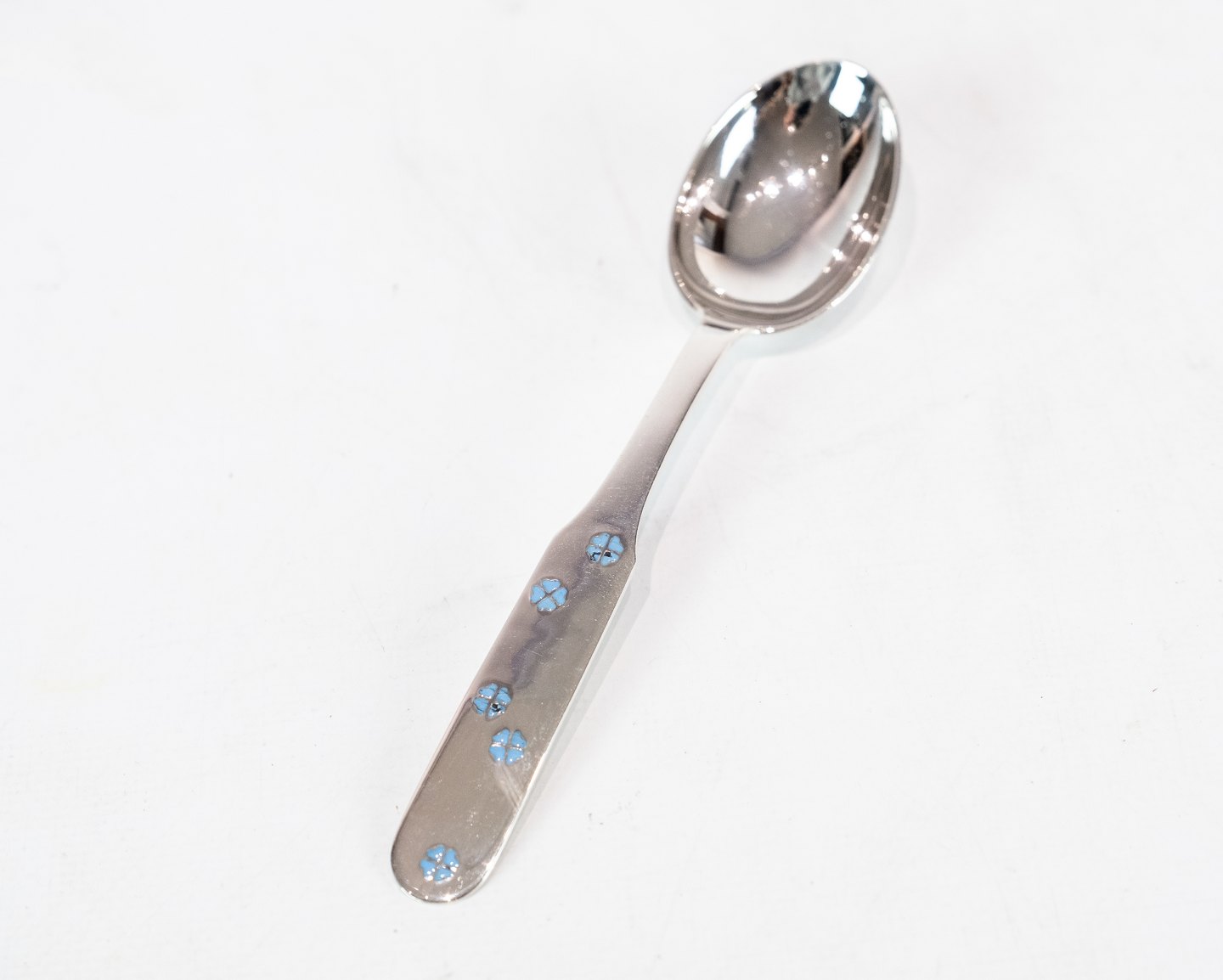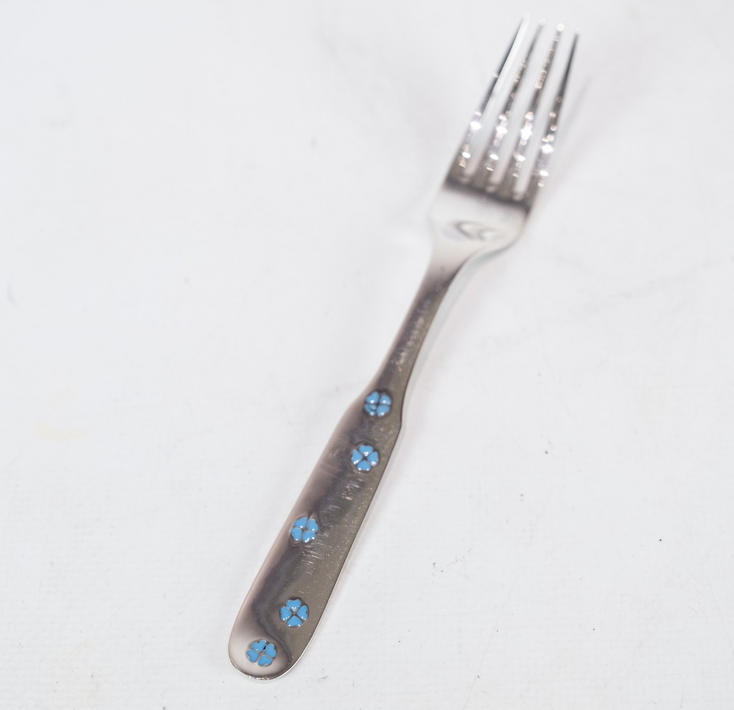 SoldSet of children's spoon and fork decorated with blue flowers of 925 sterling silver.