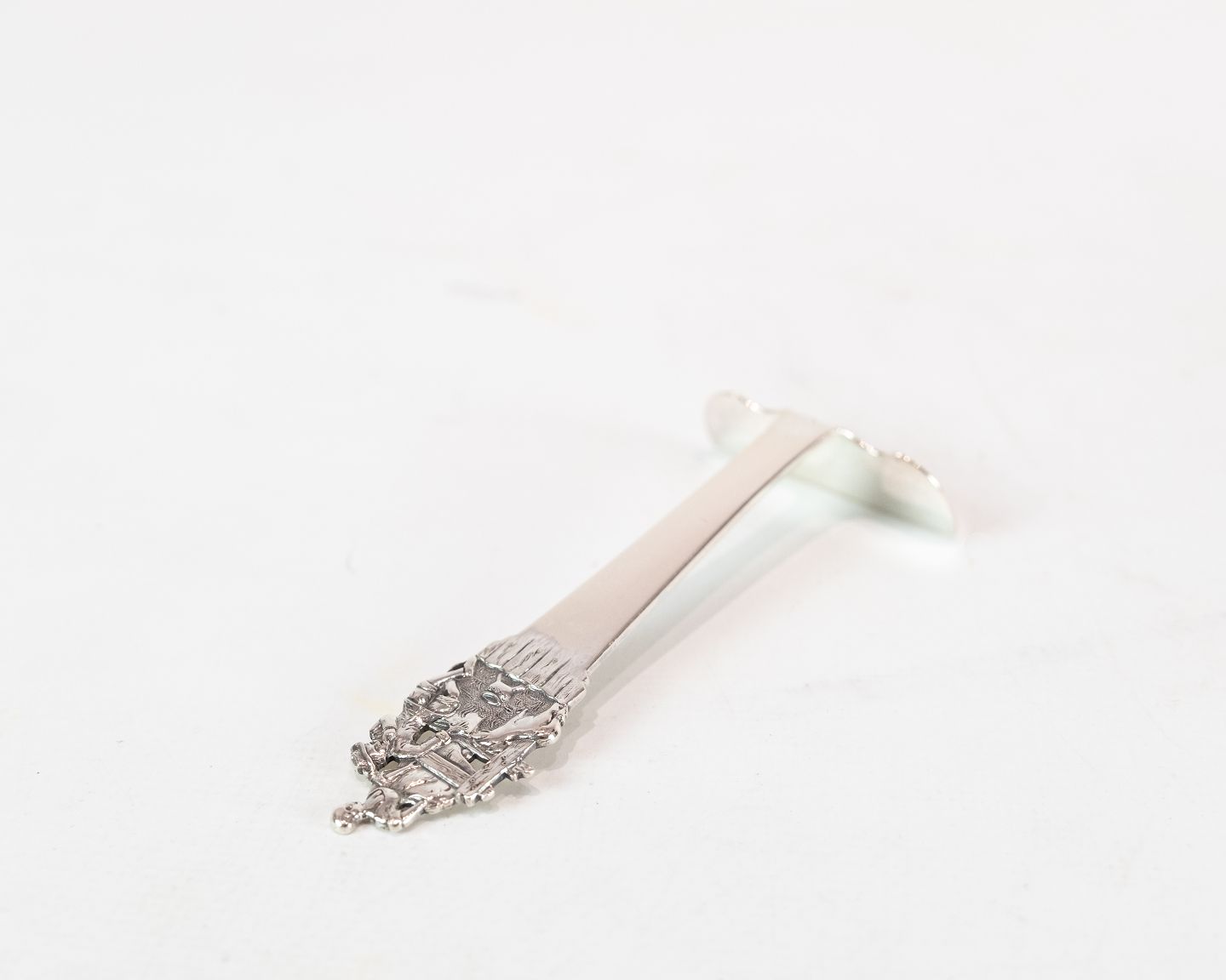 Pusher for food with the motif of H.C. Andersen's Clumsy Hans in hallmarked silver.