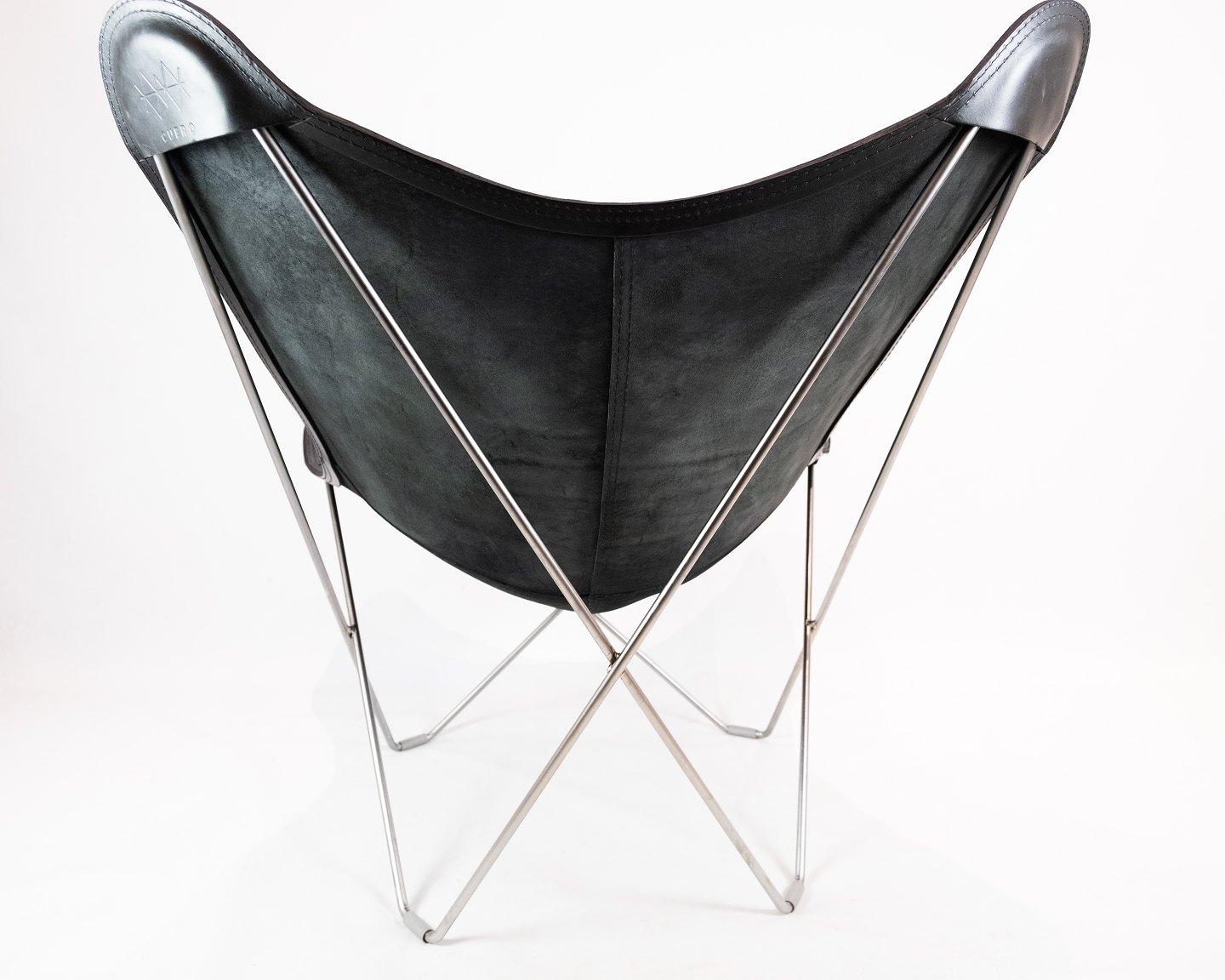 SoldButterfly easy chair, model Pampa Mariposa, of black elegance leather by Cuero Design. The chair is in great used condition.