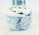Bordlampe i blåmalet porcelæn af Bing og Grøndahl. Skærmen er håndmalet og håndfoldet i papir.