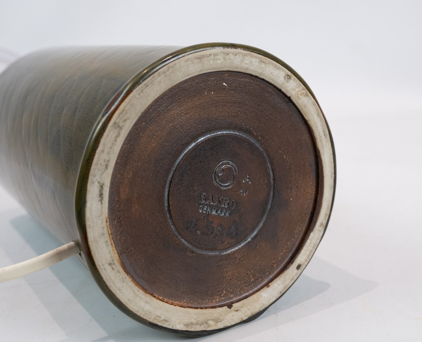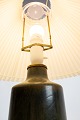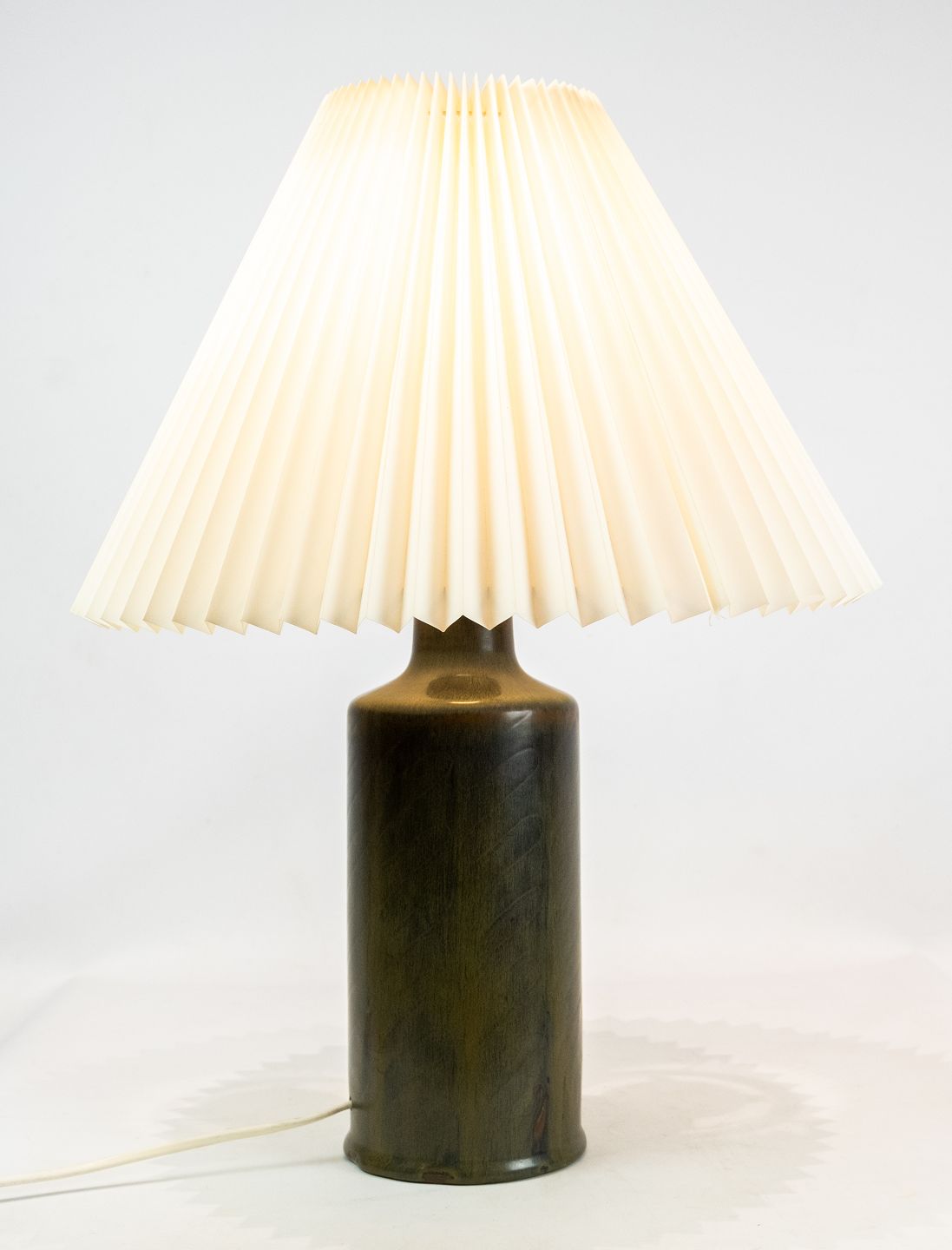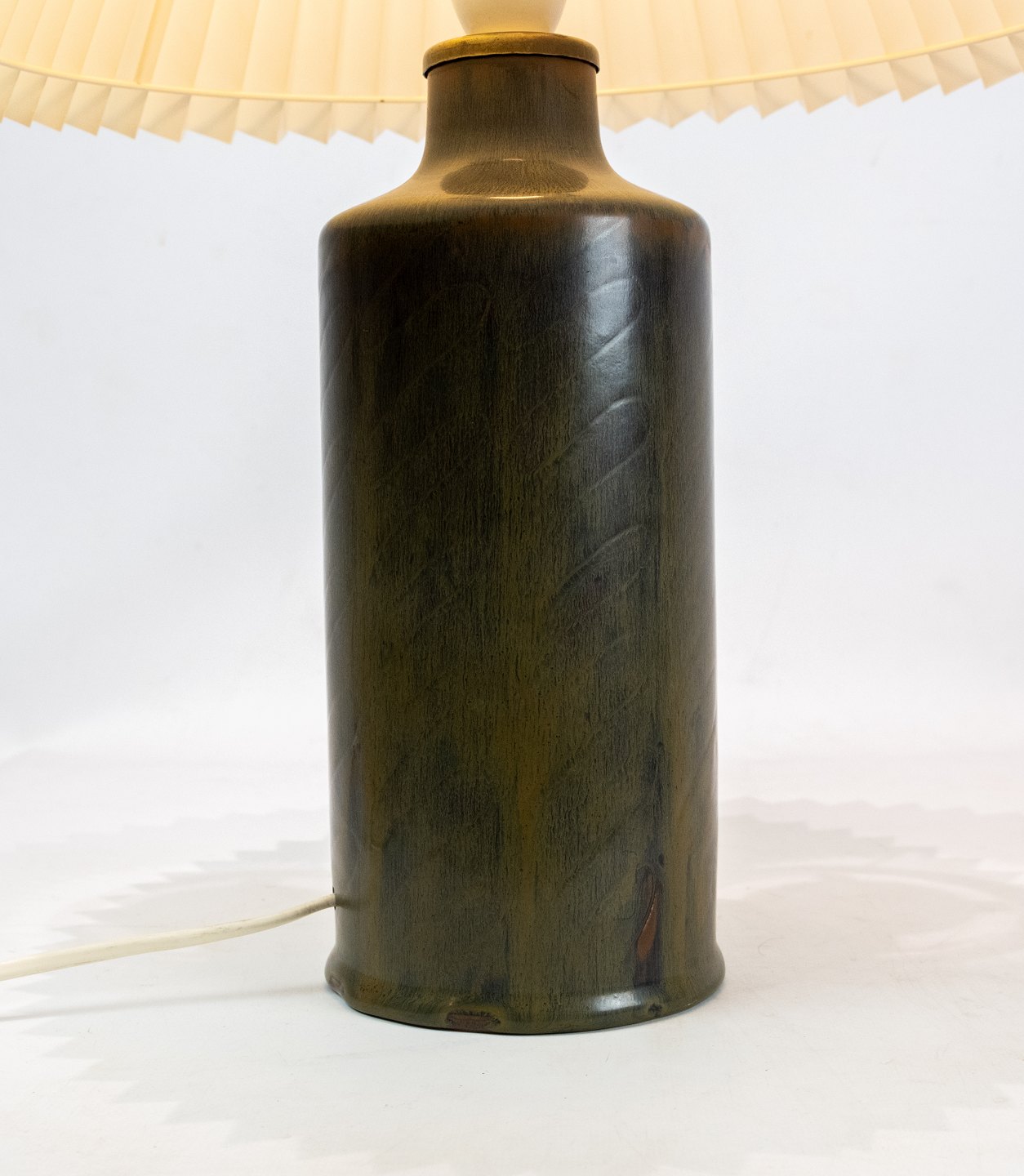 Ceramic table lamp in dark green color by Eva Stær Nielsen for Saxbo. The shade is hand folded and hand painted in paper.