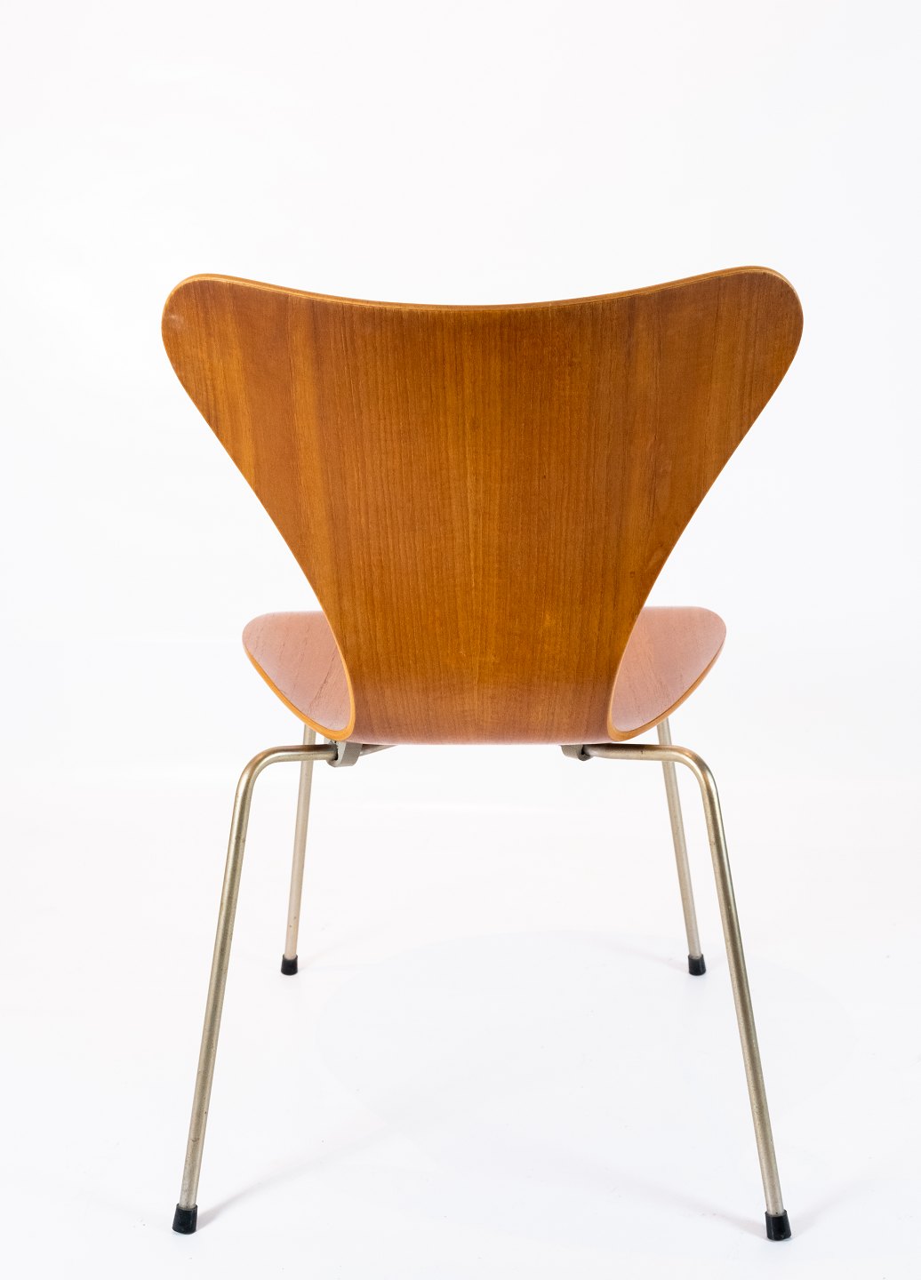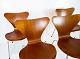 Et sæt af fire Syver stole, model 3107, designet af Arne Jacobsen og fremstillet af Fritz Hansen. Disse stole, i smukt teaktræ, udstråler en tidløs elegance og enestående håndværk.