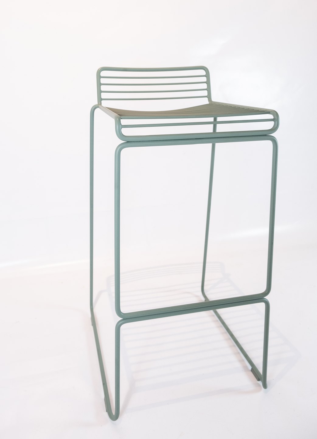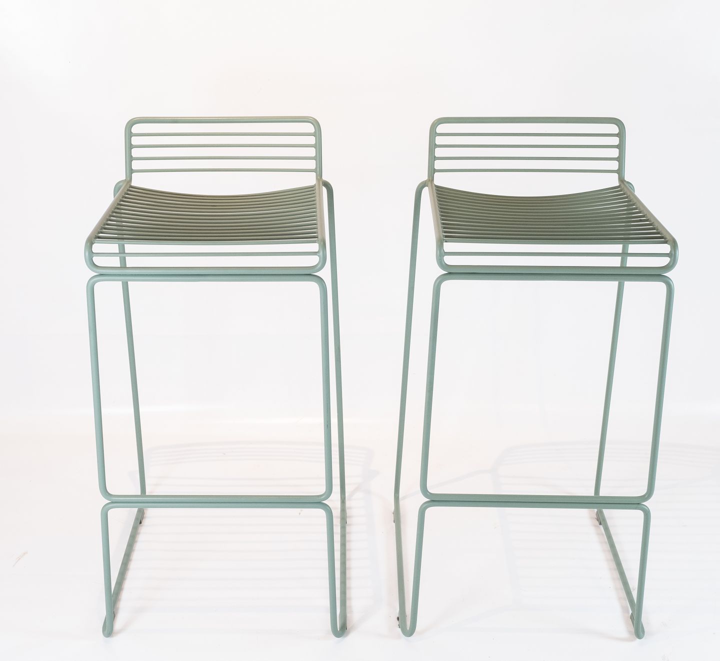 Et par barstole, model Hee, med metalstel i lakeret lyseblåt, produceret af HAY. Disse barstole er et perfekt eksempel på moderne skandinavisk design, der kombinerer funktionalitet med enkel elegance.