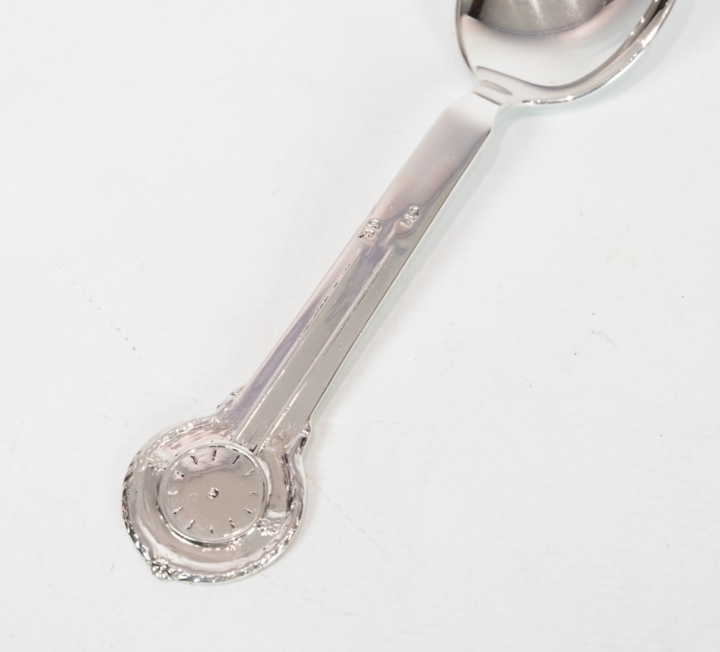 SoldChildren's spoon decorated with clock of hallmarked silver.