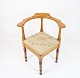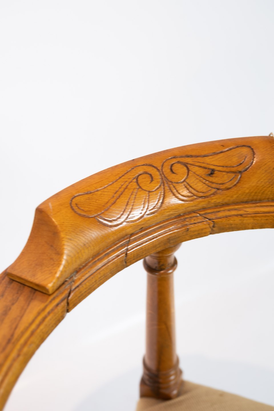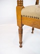 Armstol i poleret egetræ og polstret med lyst broderet stof fra 1910erne.