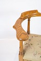 Armstol i poleret egetræ og polstret med lyst broderet stof fra 1910erne. Stolen er i flot antik stand.