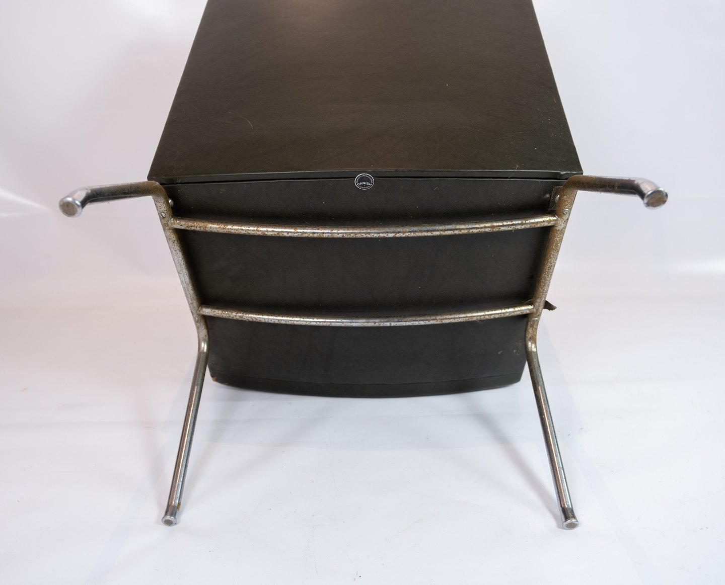 Wegner's design for the CH401 lounge chair demonstrates a mastery of minimalist aesthetics. The chair's simple tubular-steel frame challenges the notion that upholstered furniture must be large or bulky. Wegner ingeniously concealed the mechanisms for attaching the upholstered fabric to the frame with a slender, angled element made of stainless steel, resulting in a clean and uncluttered appearance.