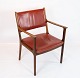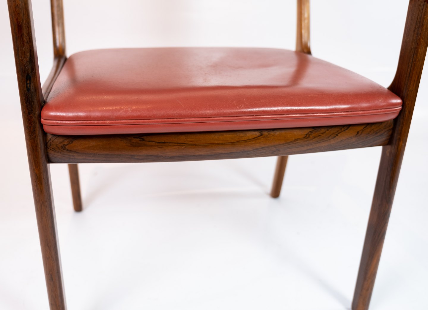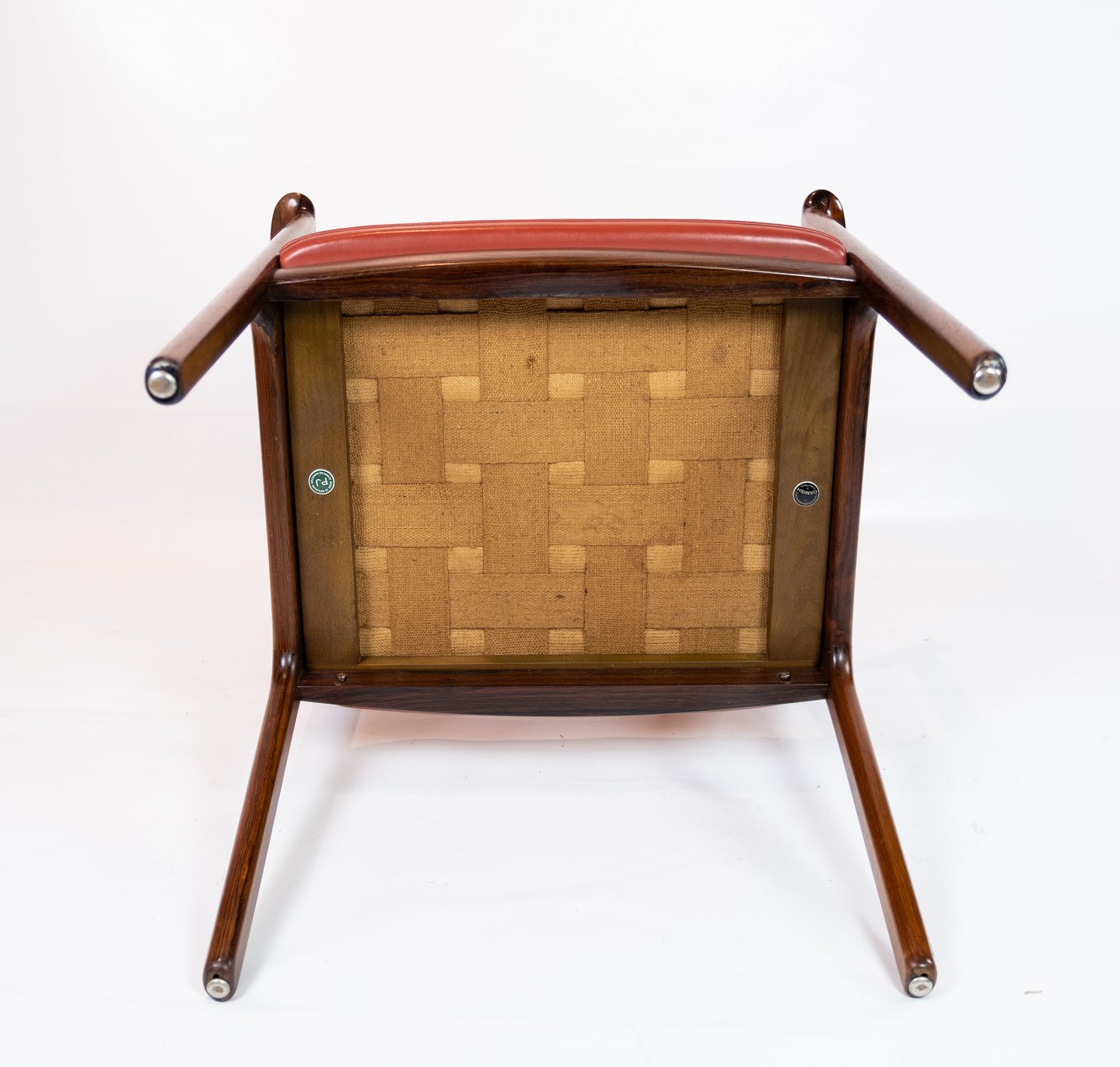 These armchairs are a beautiful example of mid-20th century Danish furniture design and represent the best in aesthetics and craftsmanship. The distinctive rosewood frame lends a warm and luxurious atmosphere to any decor, while the maroon leather upholstery adds comfort and elegance.