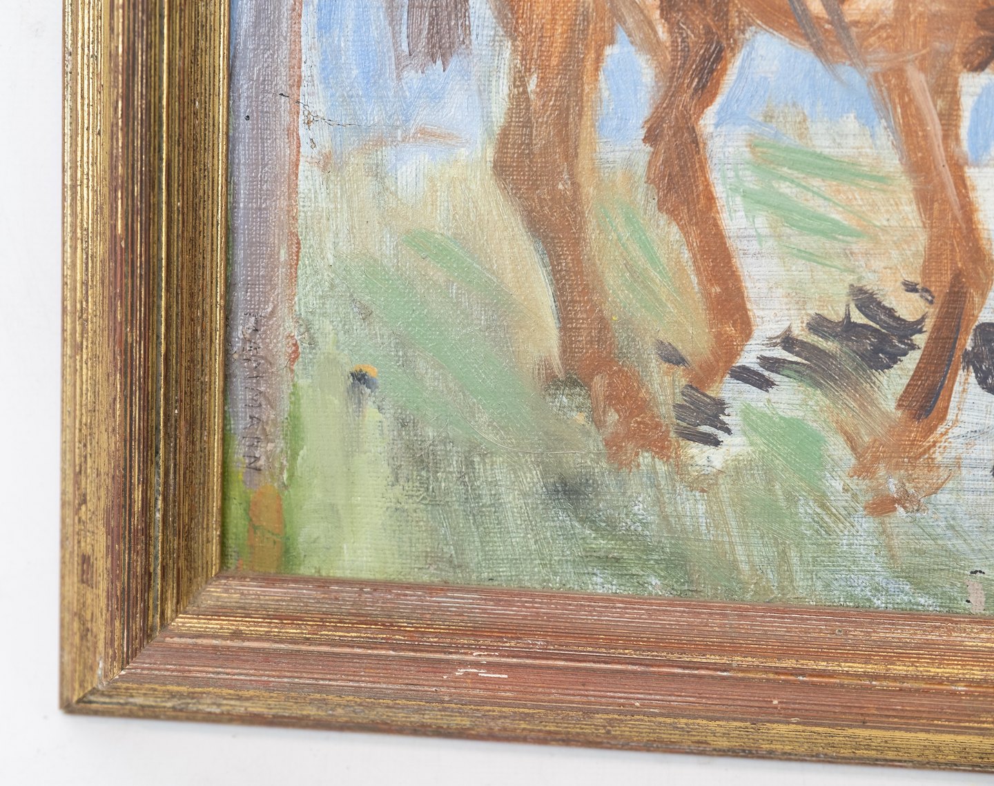 SoldOil painting with horse motif and with gilded frame.