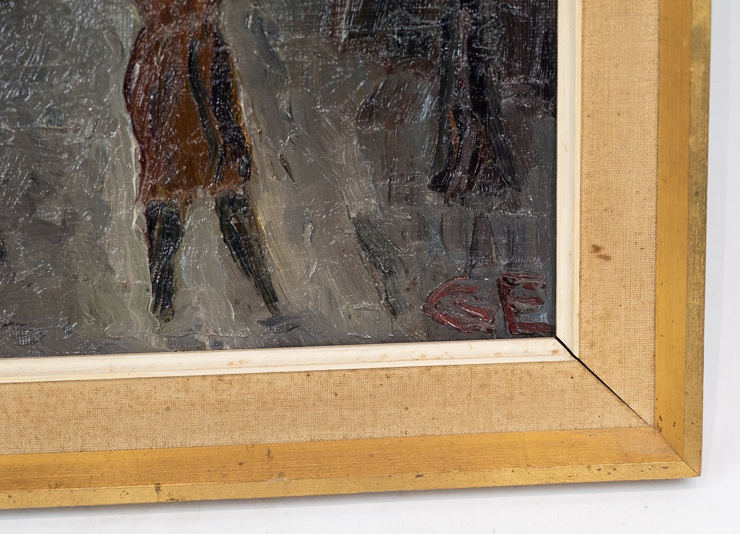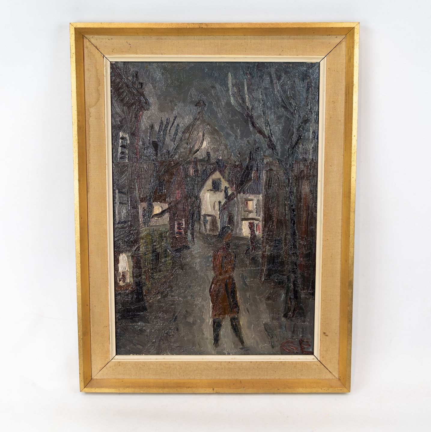 Oil painting in dark colours signed GE and with gilded frame.