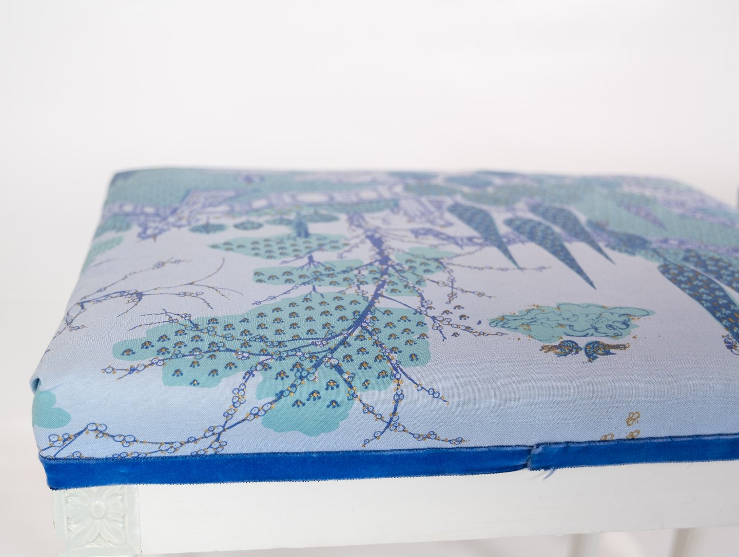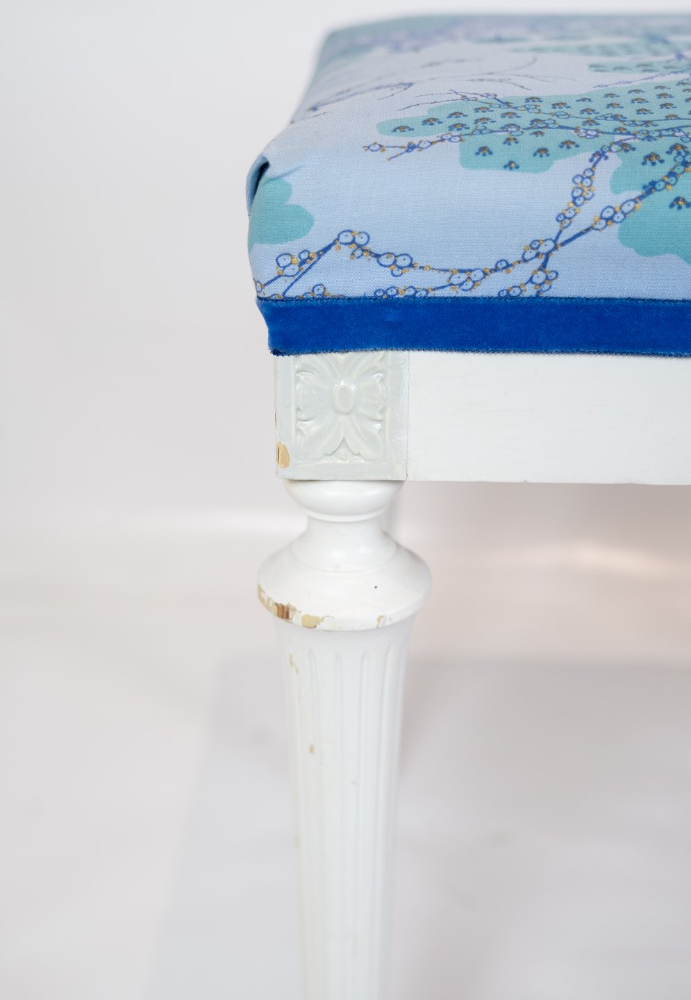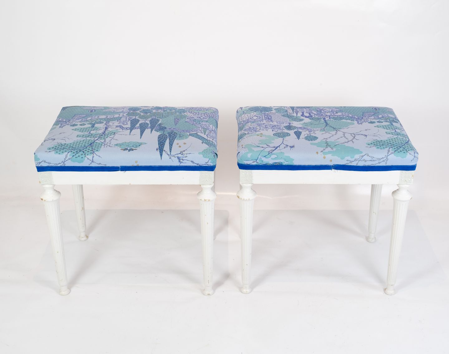 A pair of antique stools of white painted wood and upholstered with blue fabric from the 1920s. The stools are in great vintage condition.