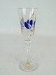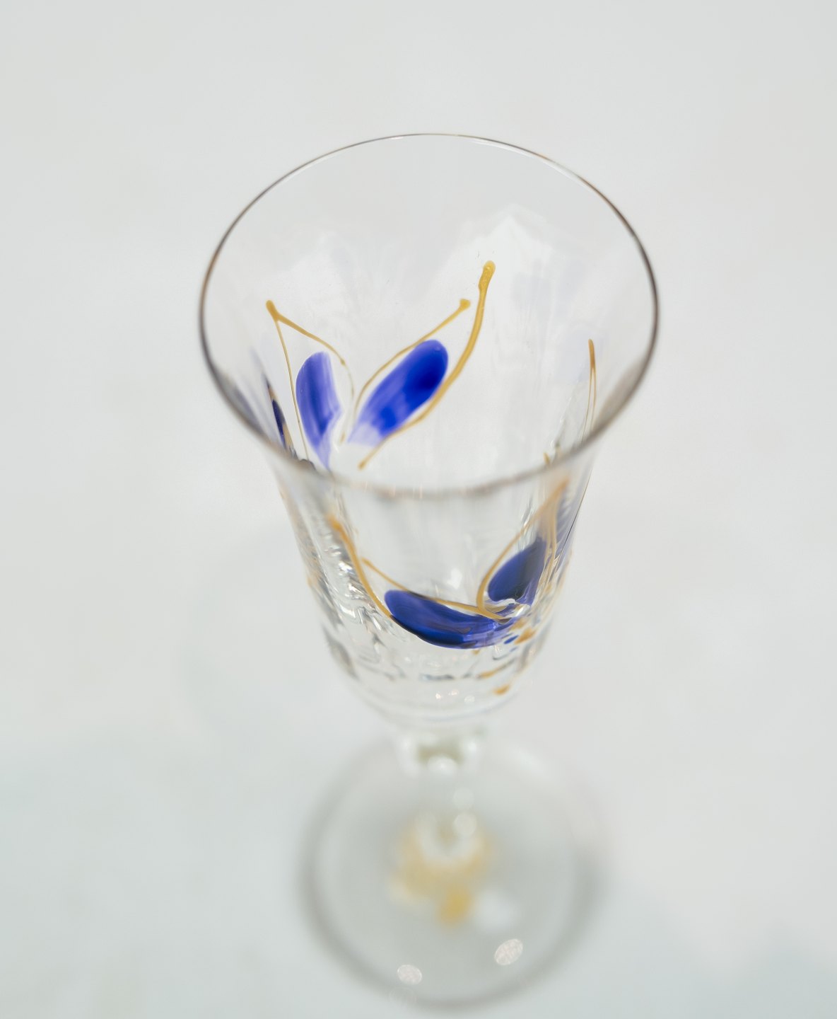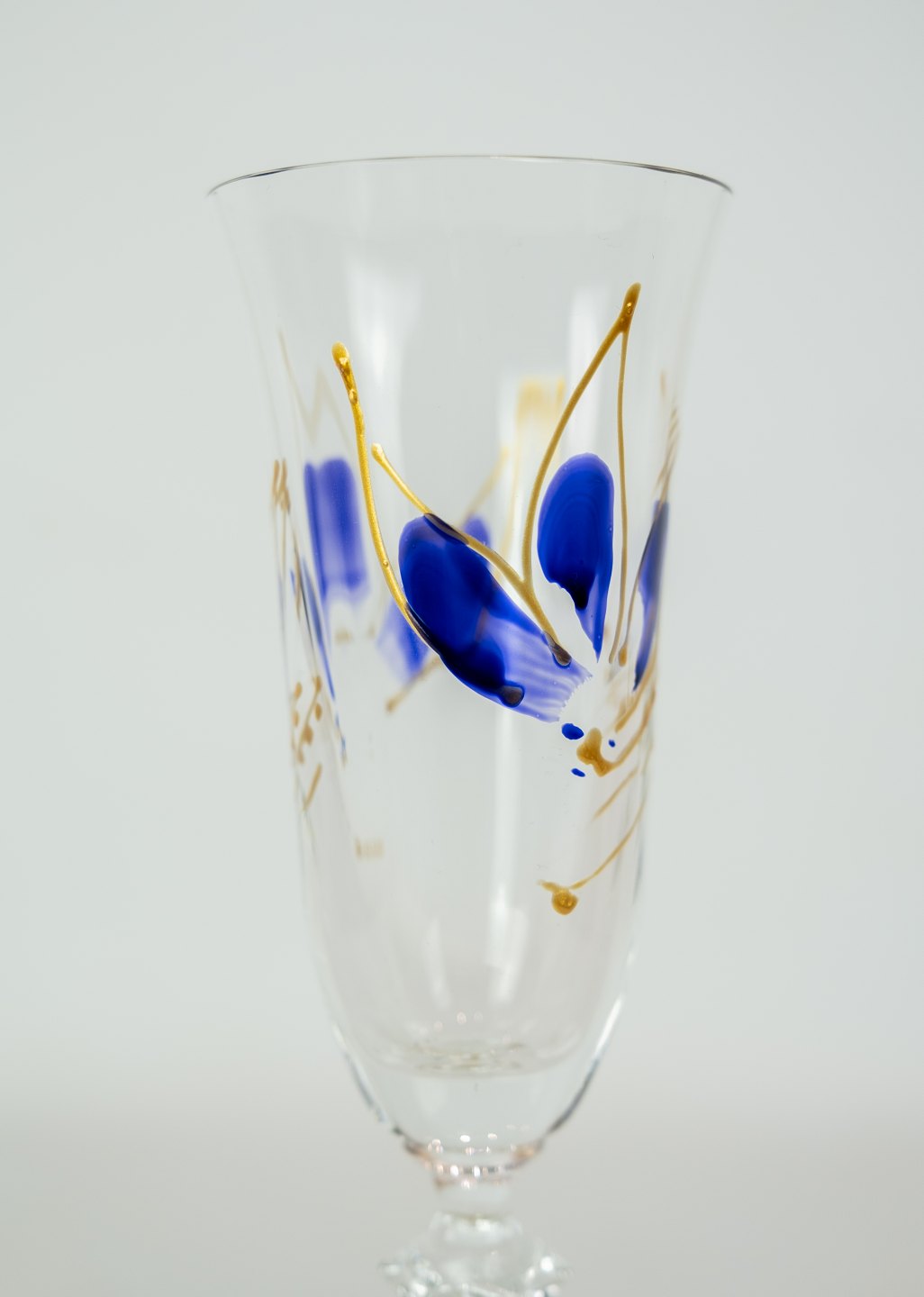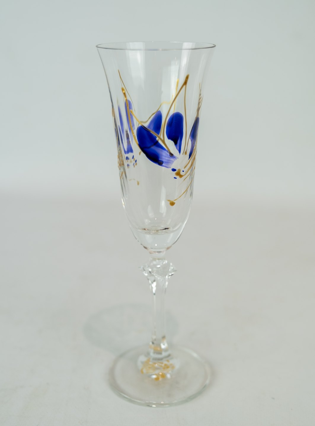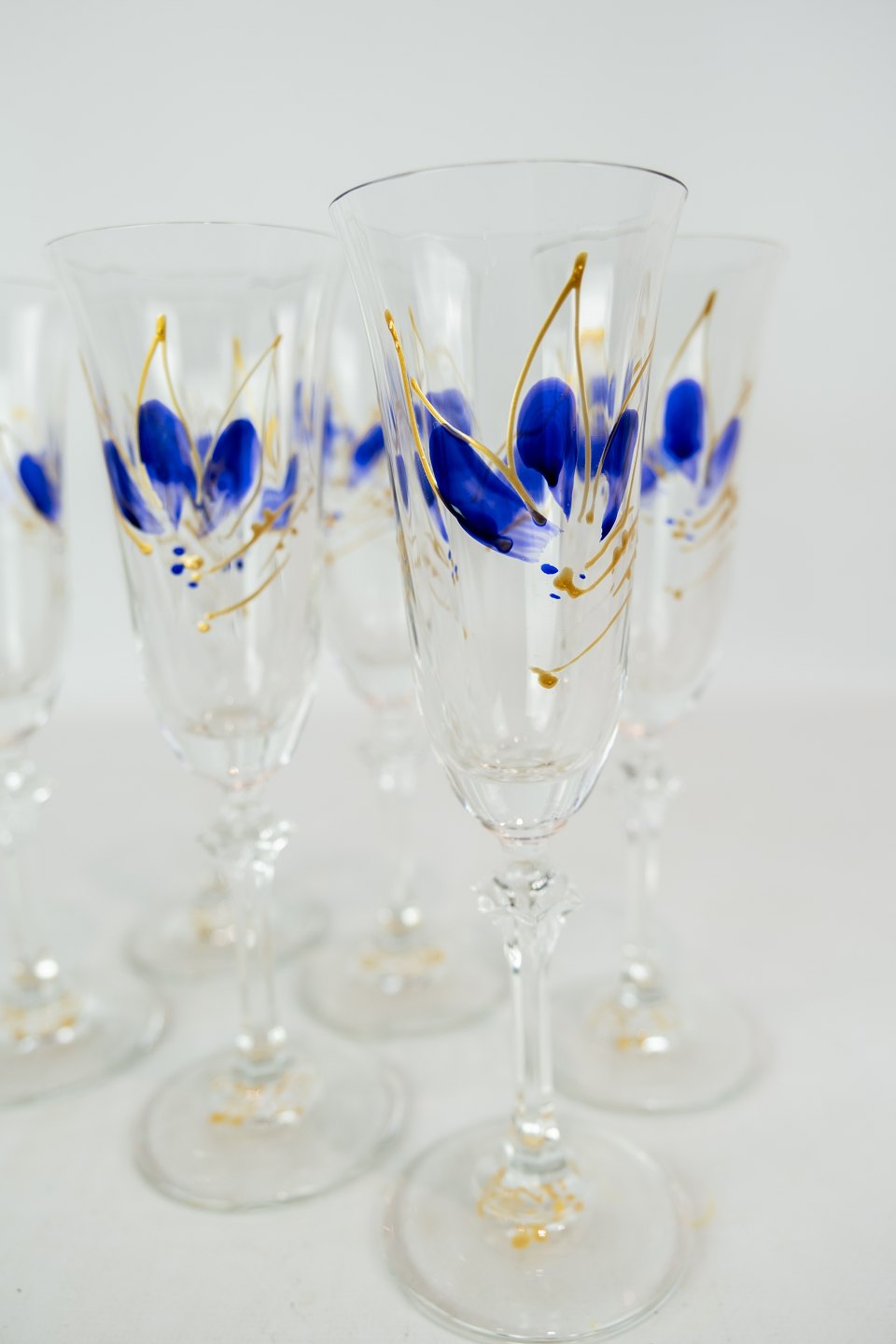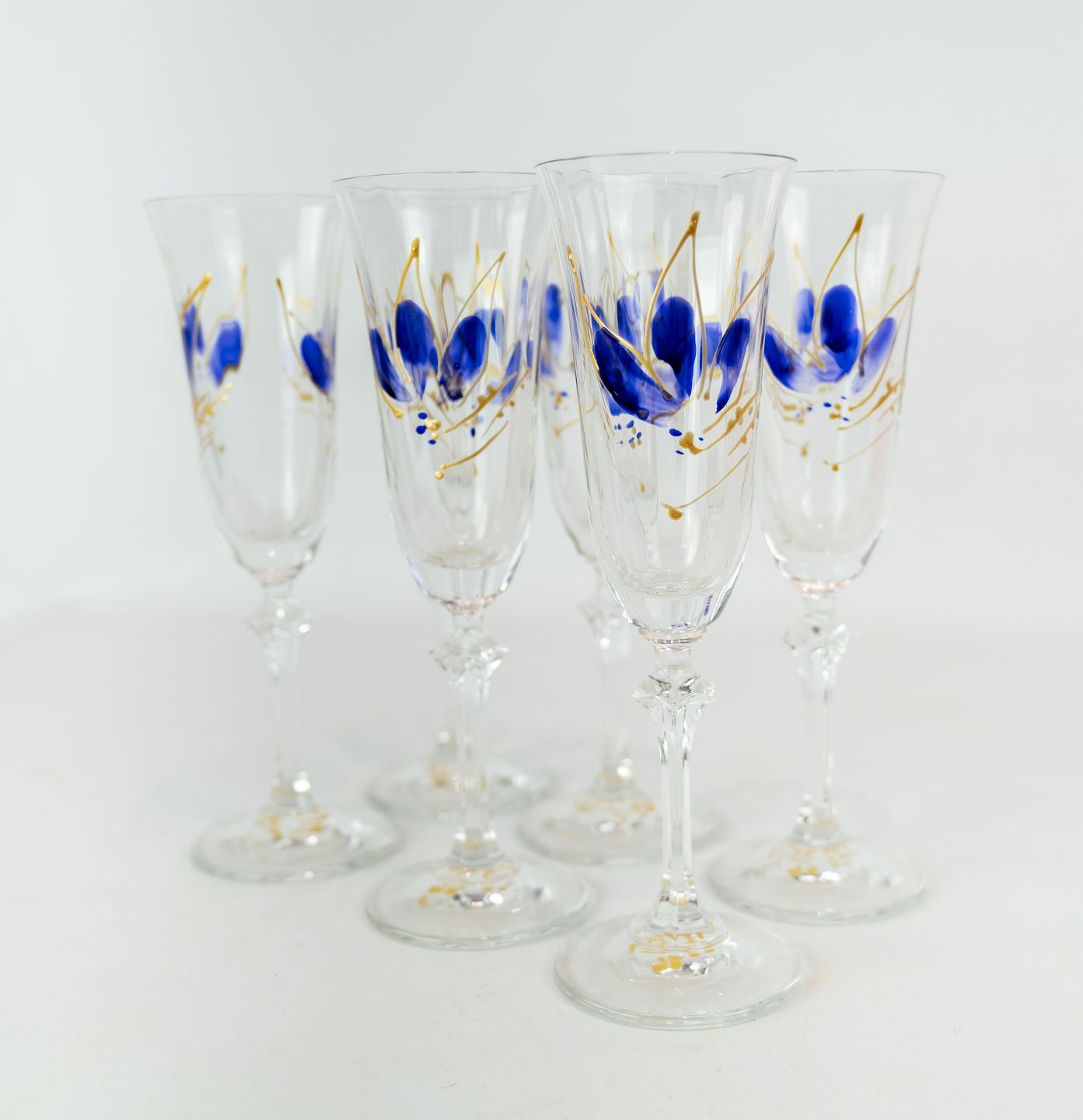 Soldset of six champagne glass decorated with blue and gold flowers.