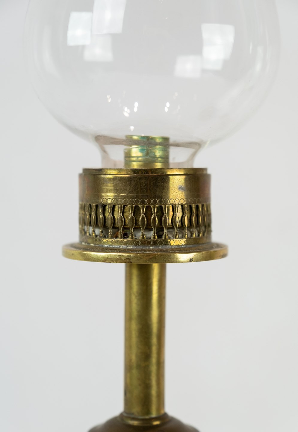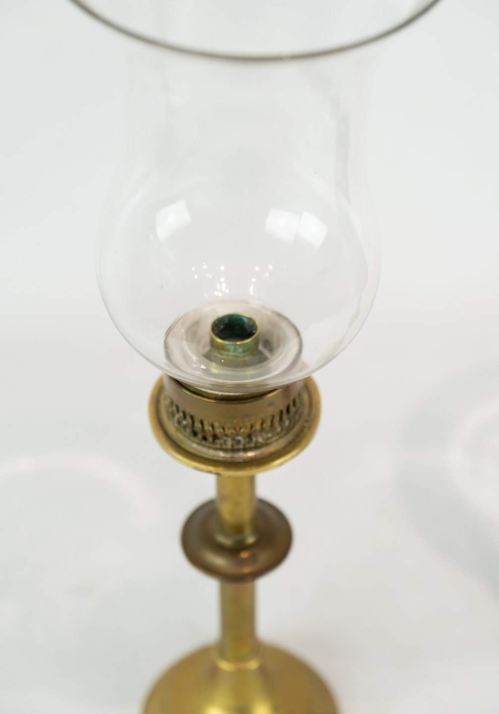 A pair of Hurricane candlesticks of brass and glass from the 1930s, both are in great vintage condition.