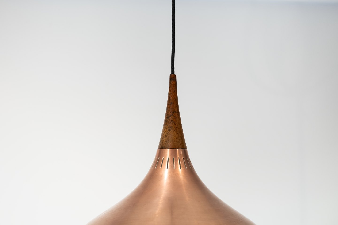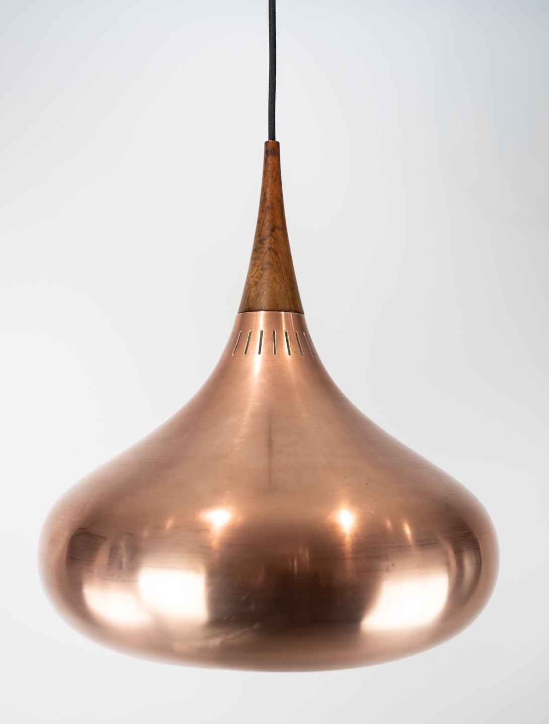 SolgtOrient pendel, model P2, designet af Jo Hammerborg for Fog og Mørup i Danmark i 1960erne. Lampen er af børstet kobber og palisander.