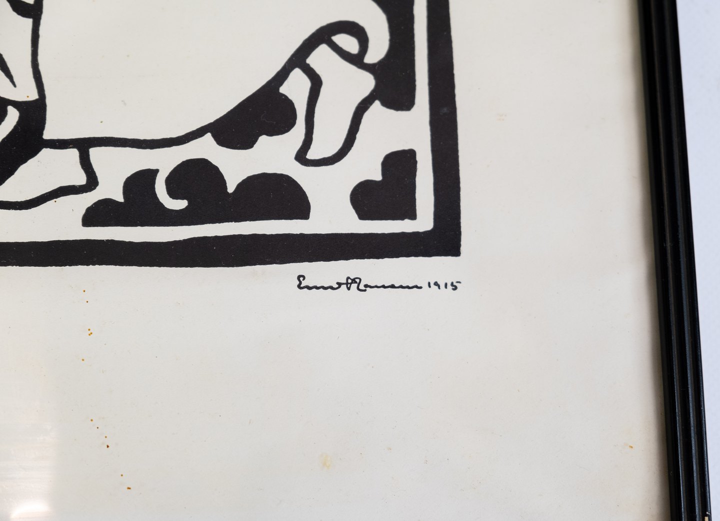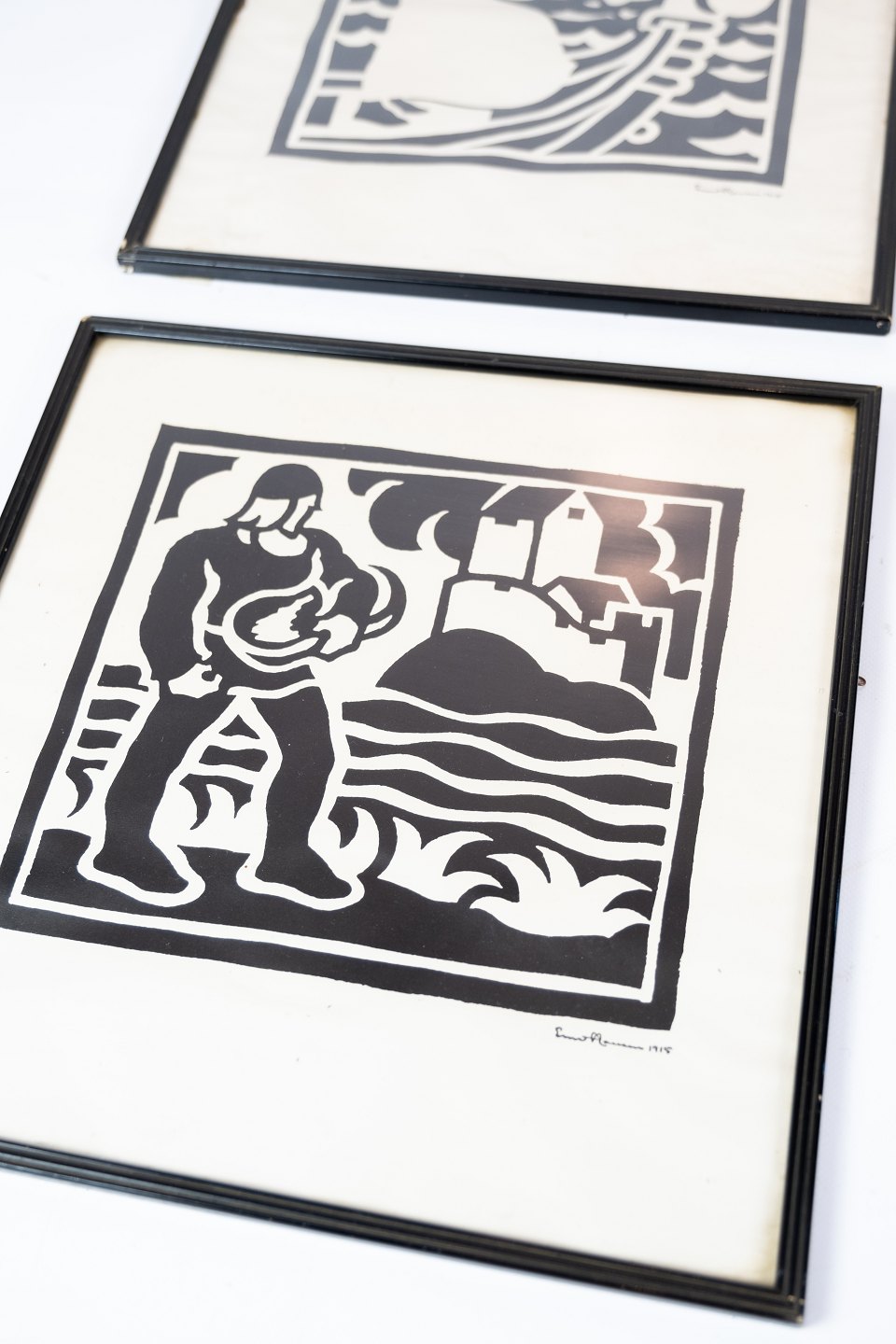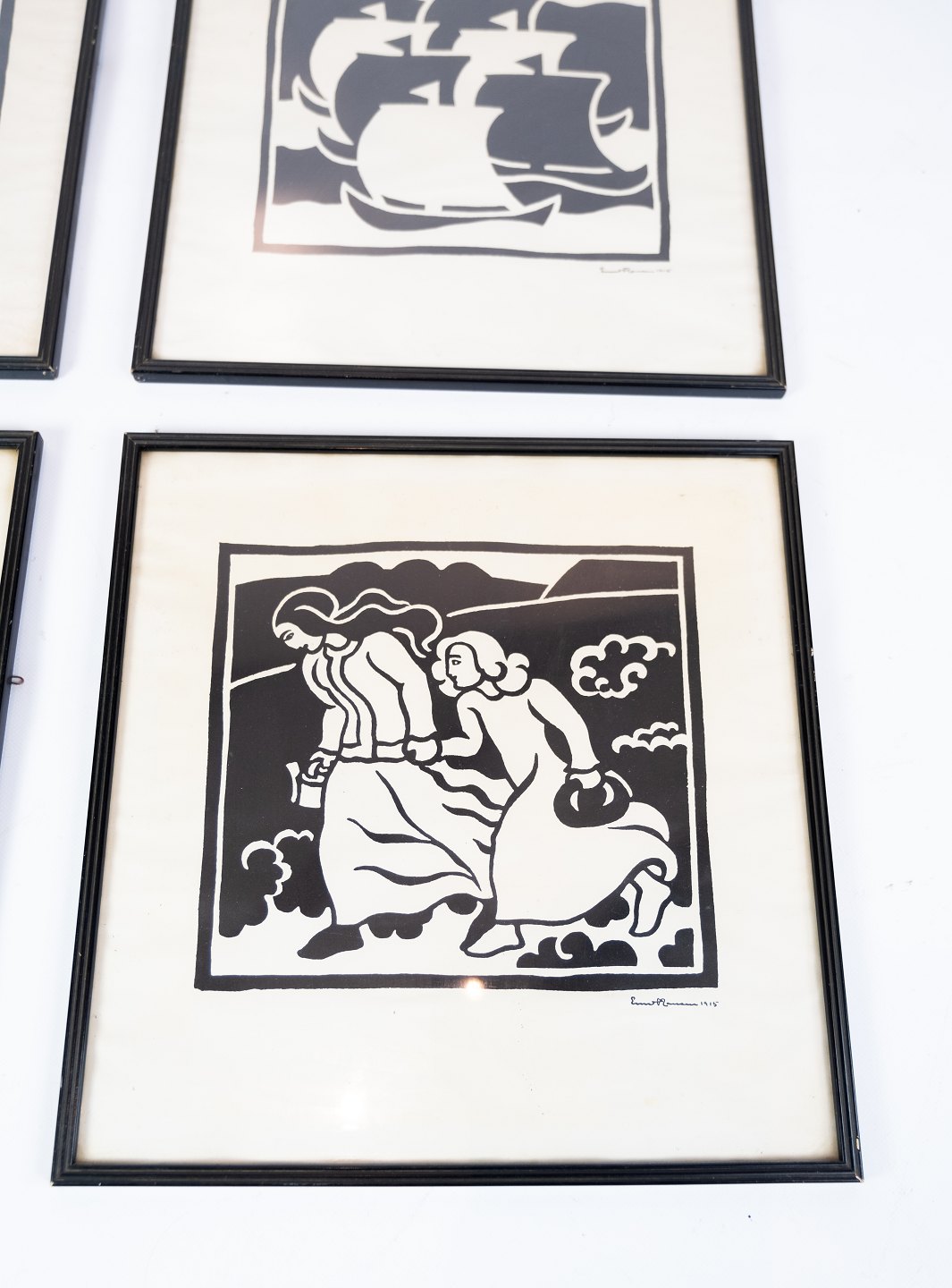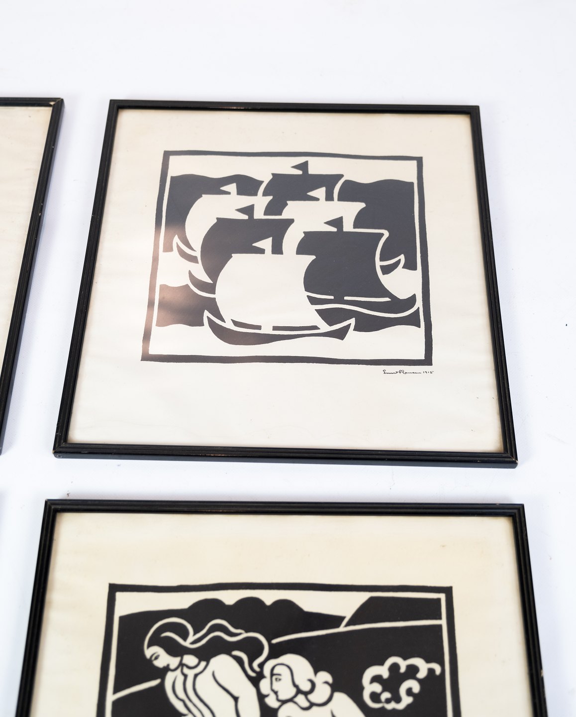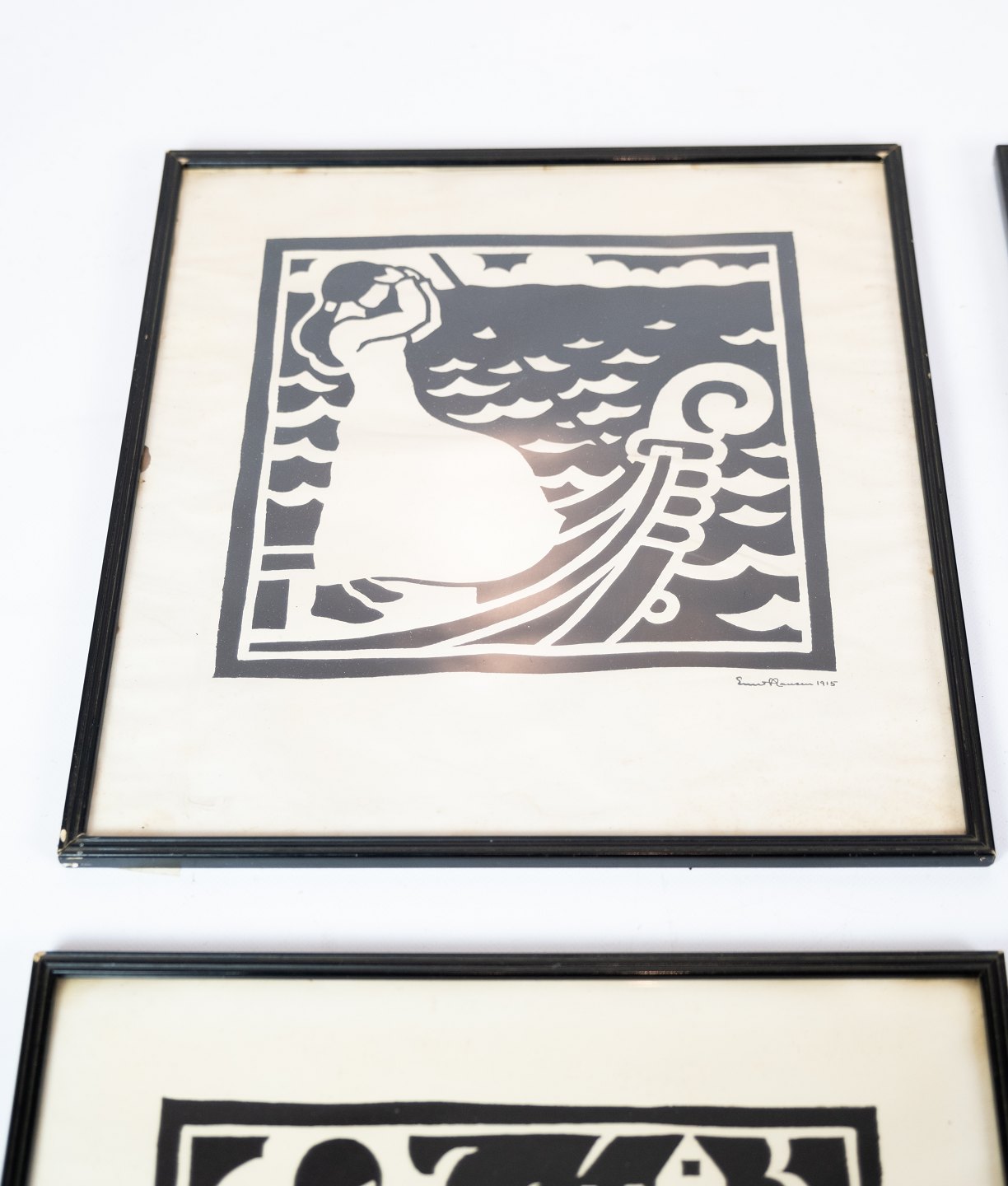 Forskellige tryk i sort og hvid fra 1915, med sort ramme af Ernst Hansen (f. 1892, d. 1968). Ernst Hansen var en dansk tegner, grafiker og maler.
