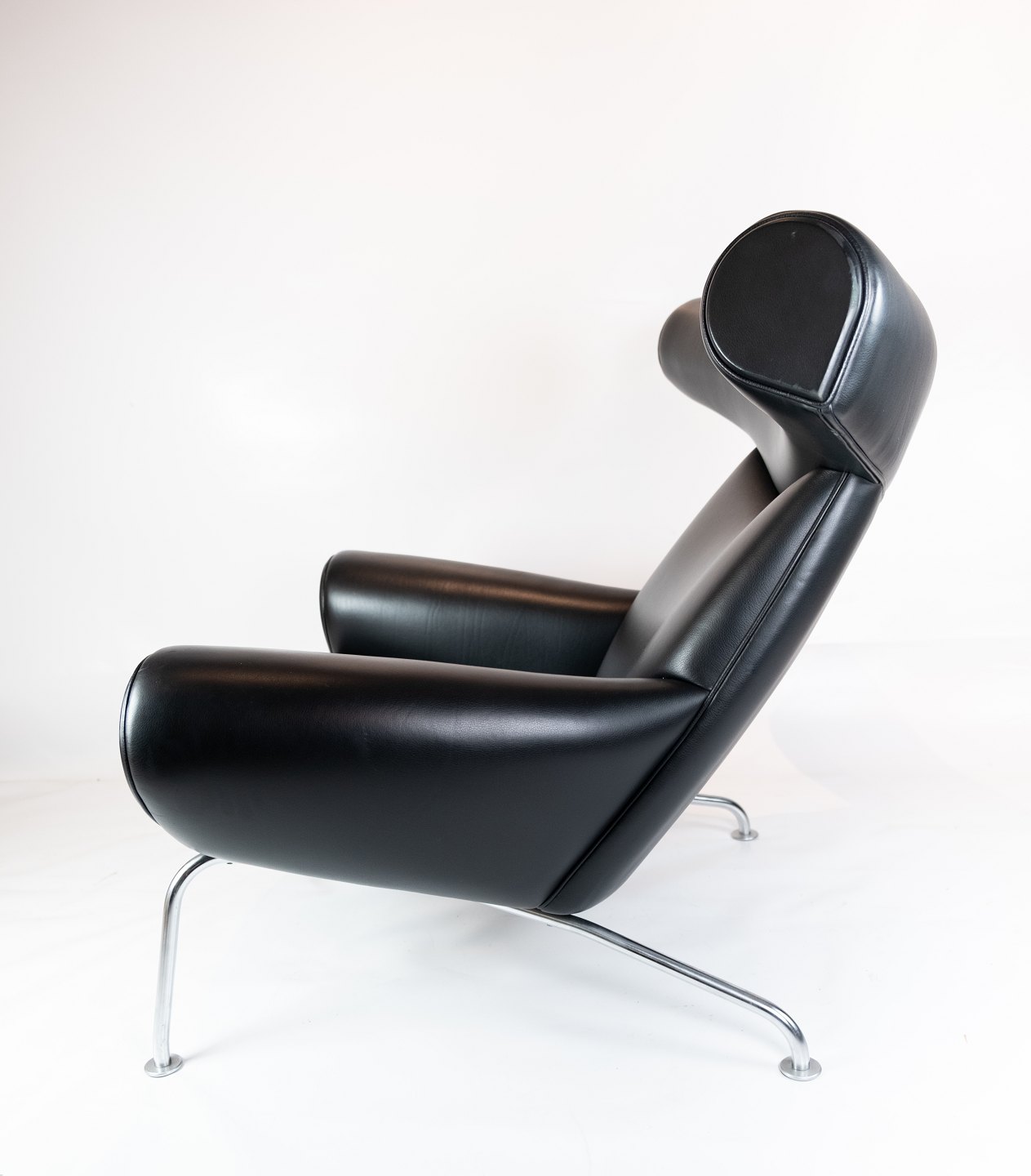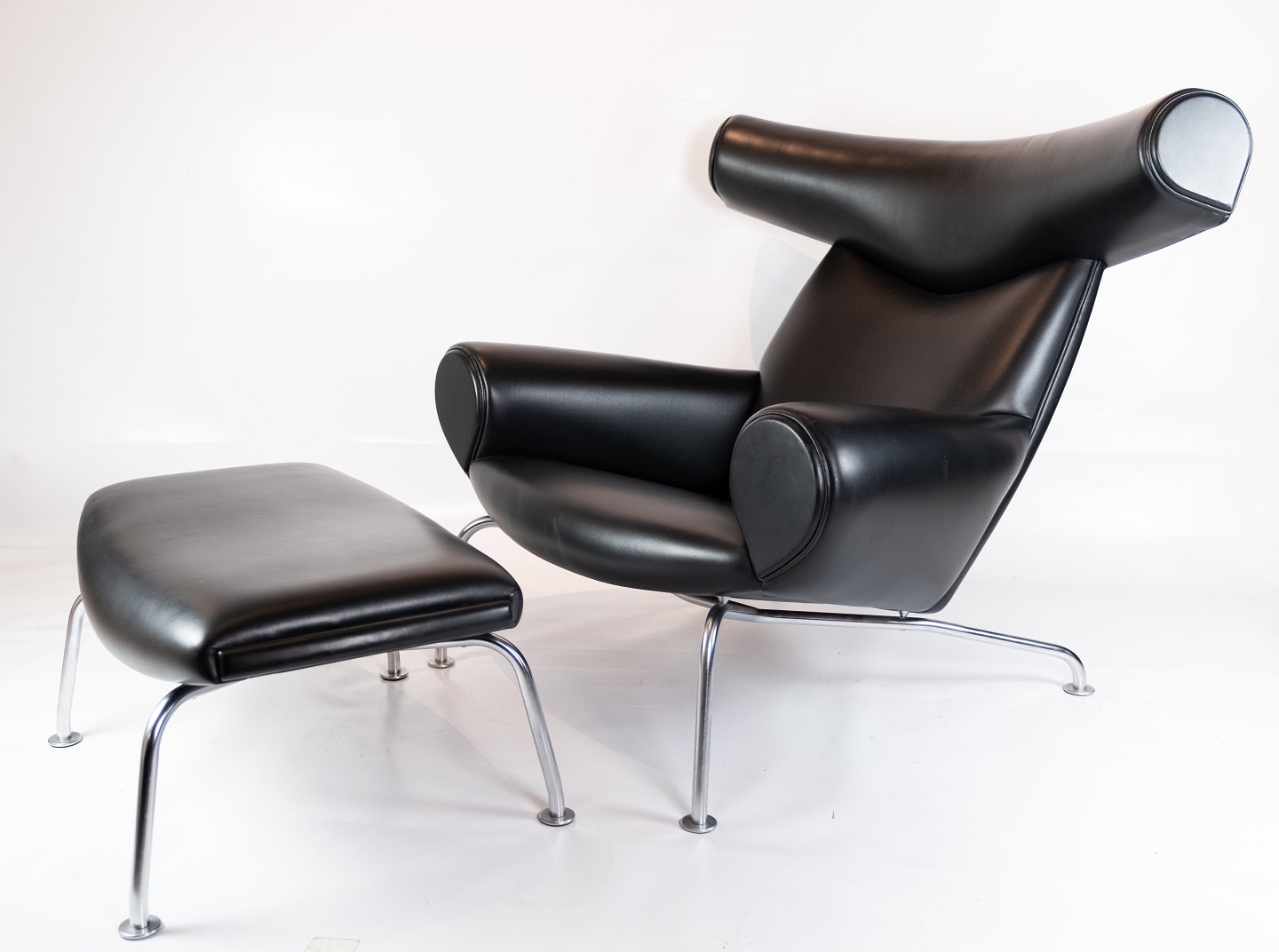 SoldThe Ox Chair, model EJ 100 upholstered in Black leather, designed by Hans J. Wegner in the 1960s and manufactured at Erik Jørgensen furniture factory. The chair is in great used condition.