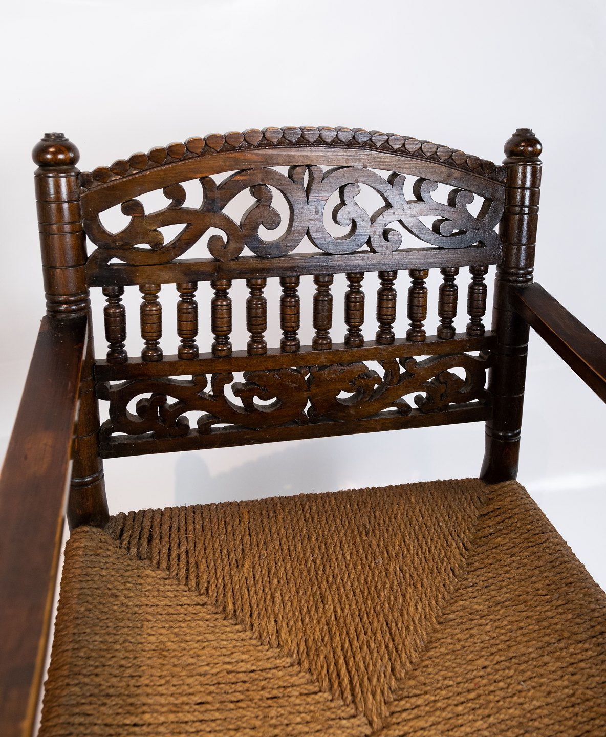 Et par antikke armstole af mørkt træ og flet fra 1920erne. Begge stole er i flot antik stand.