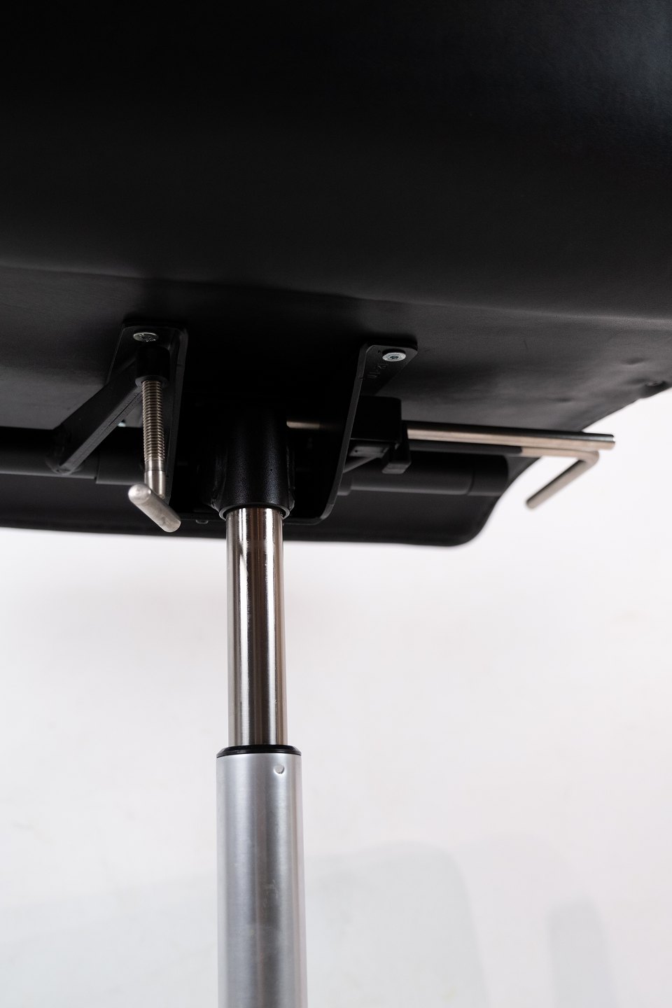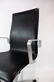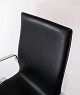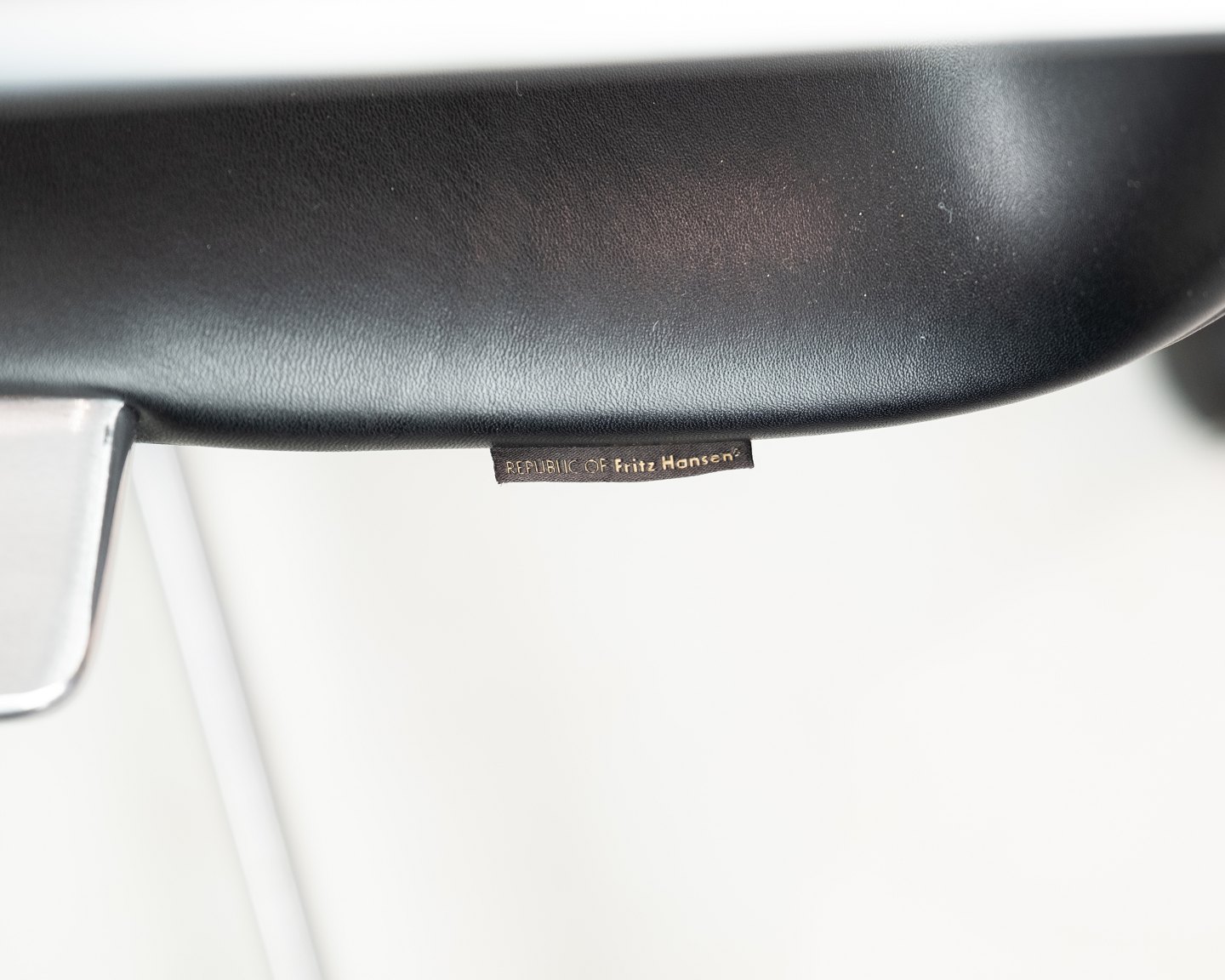 The chair is upholstered with original black leather, which adds a luxurious touch to its appearance and ensures a comfortable sitting experience. The elegant and ergonomic shape of the chair is characteristic of Jacobsen's design style and reflects his focus on both aesthetics and comfort.