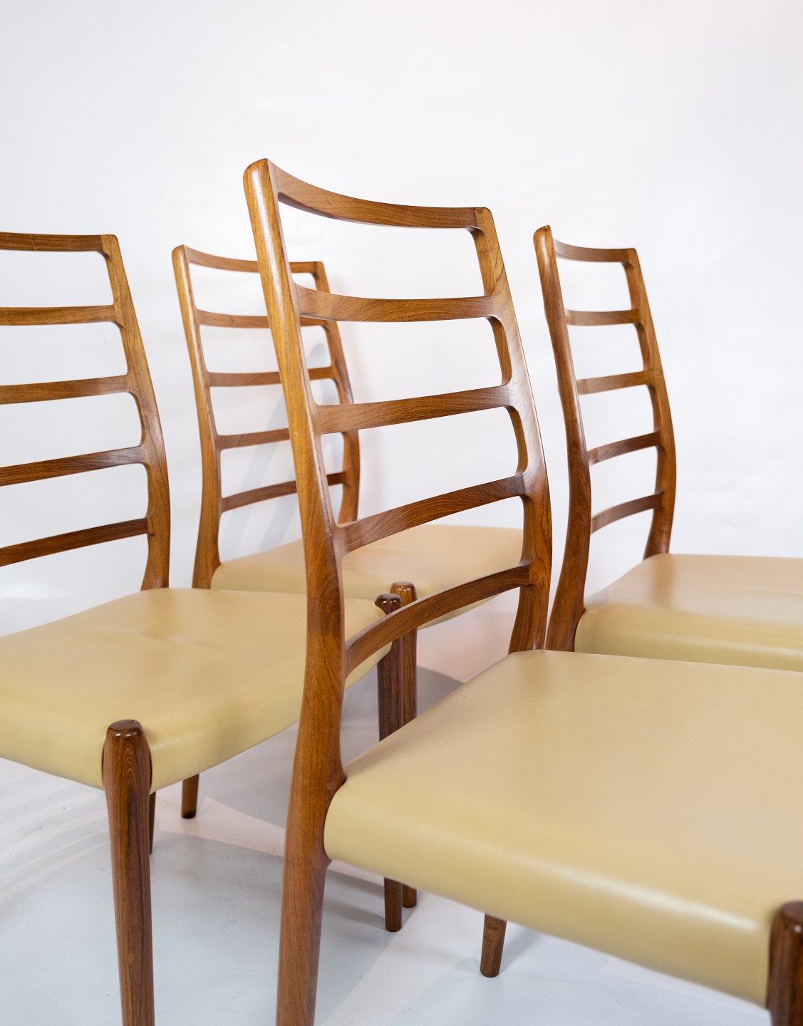 Sættet består af fire spisestuestole, model 82, designet af den anerkendte møbeldesigner N.O. Møller i 1960'erne. Disse elegante stole er fremstillet af palisander, hvilket giver dem en varm og tidløs æstetik, der passer perfekt til ethvert spiseområde eller køkken.