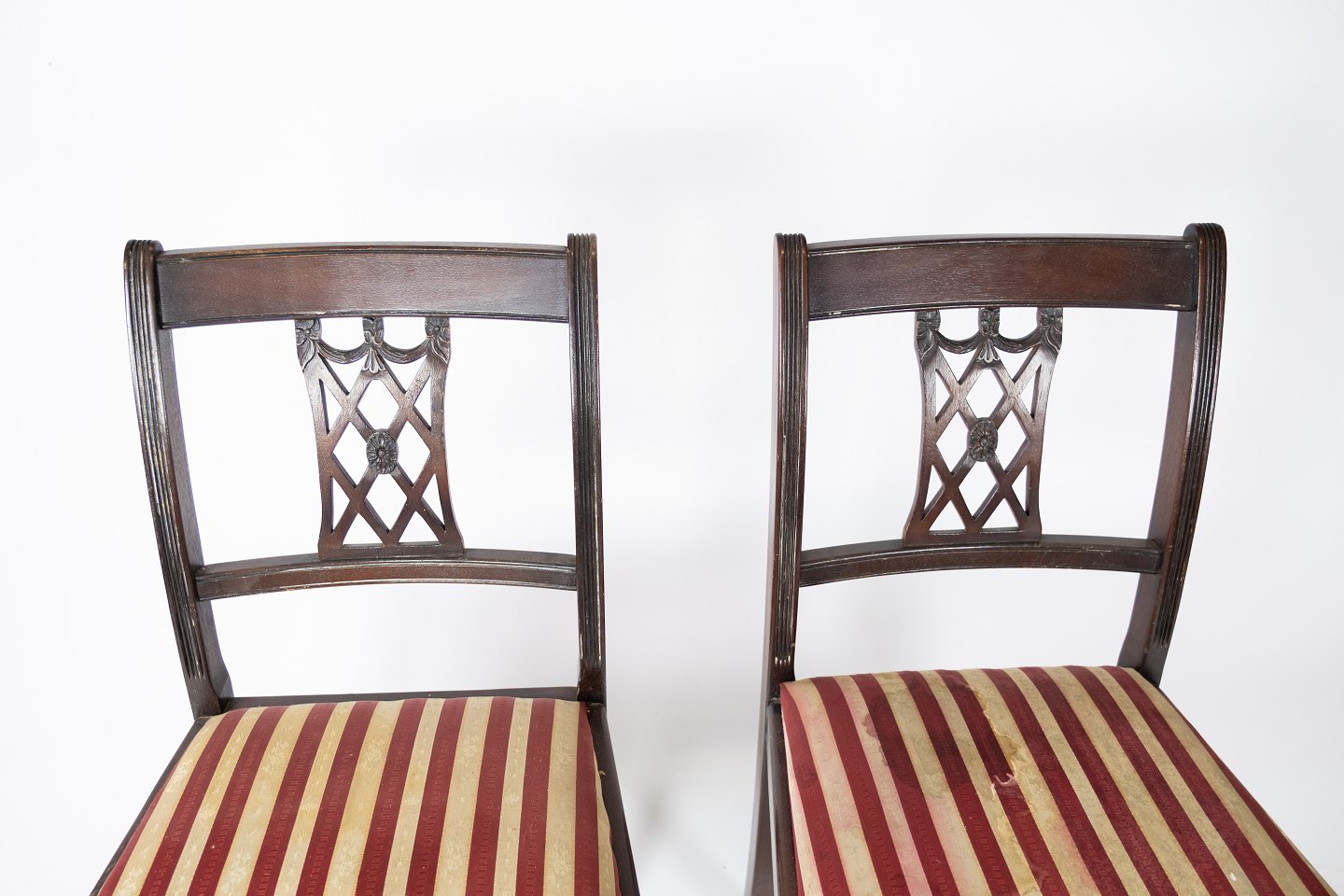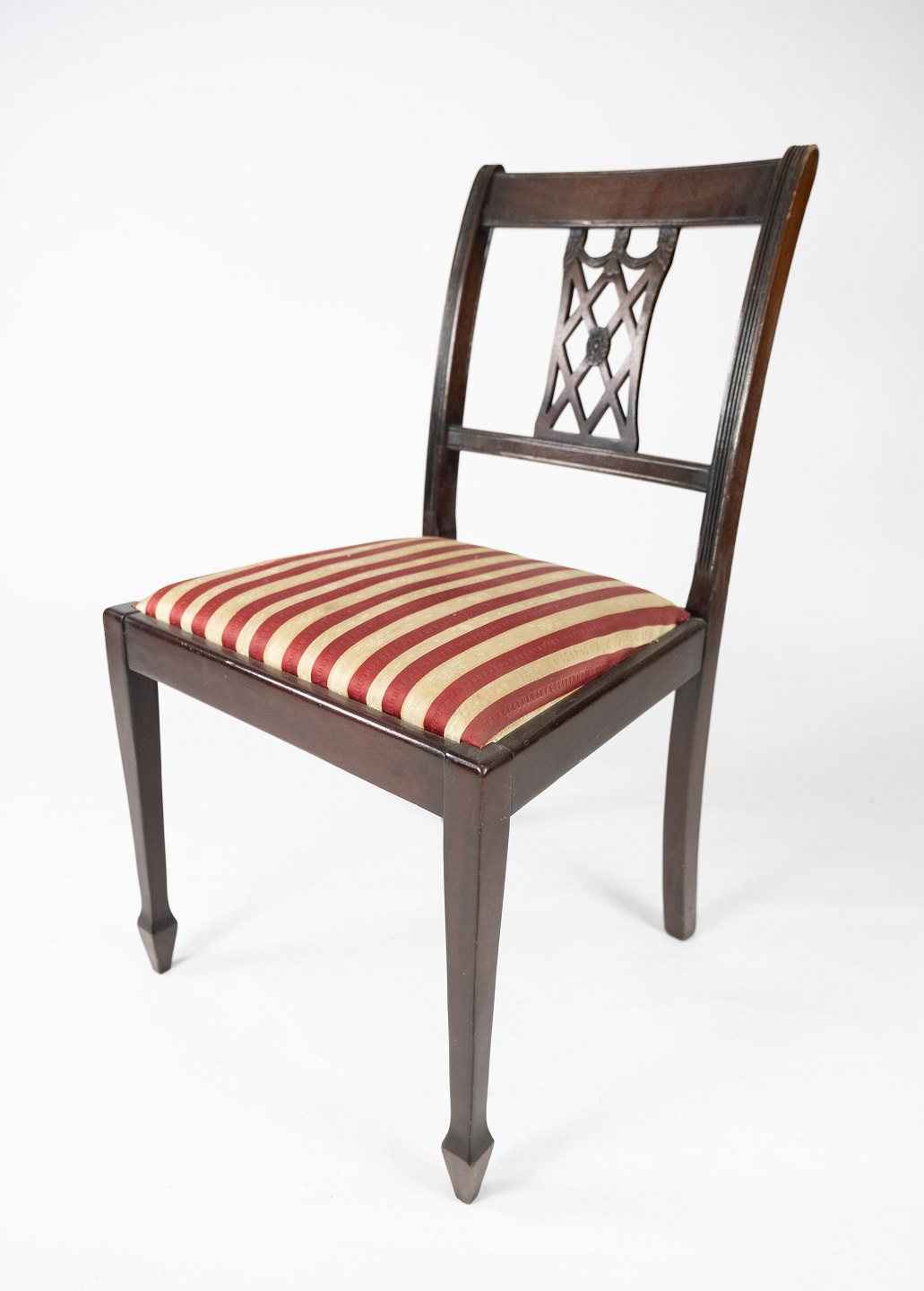 A pair of dining room chairs of mahogany and upholstered red fabric from the 1960s. The chairs are in great vintage condition.