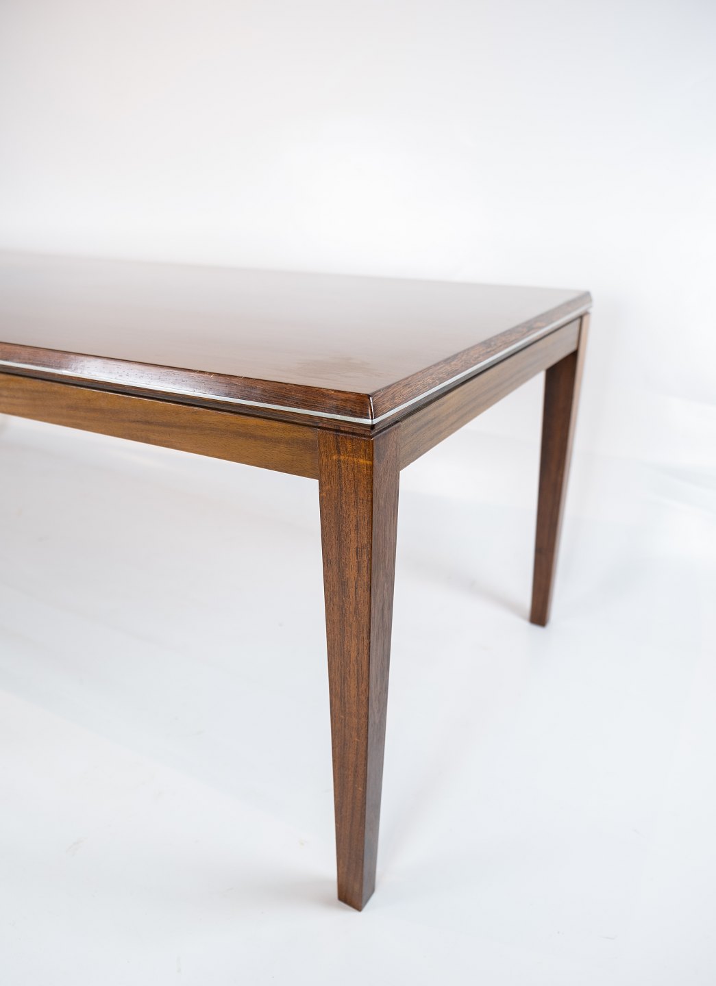 Sofabord i palisander dekoreret med metalkant af dansk design fra 1960erne. Bordet er i flot brugt stand.