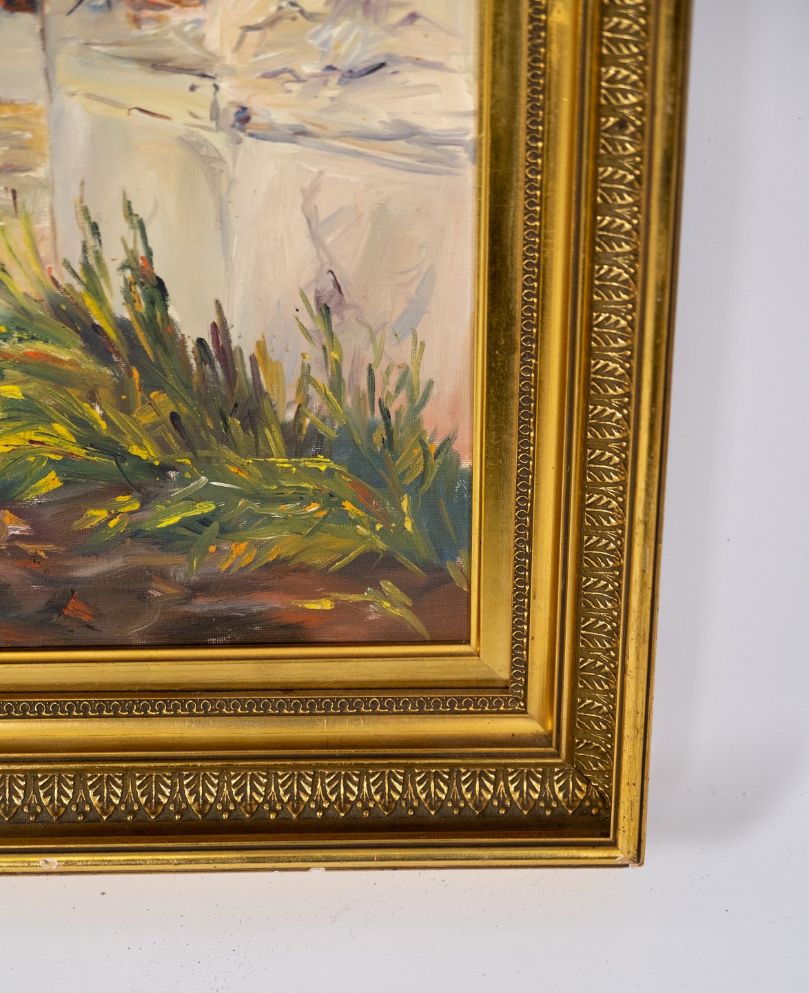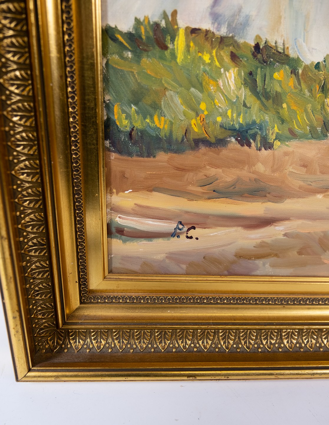 Oliemaleri med land motiv med guldramme signeret P.C. Maleriet er i flot brugt stand.