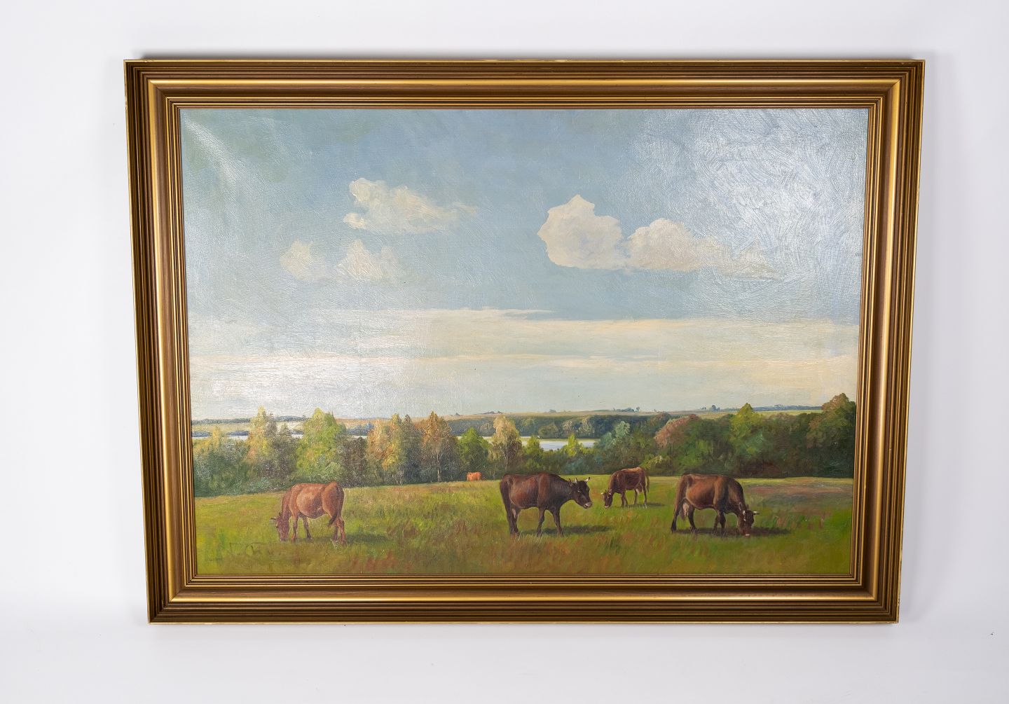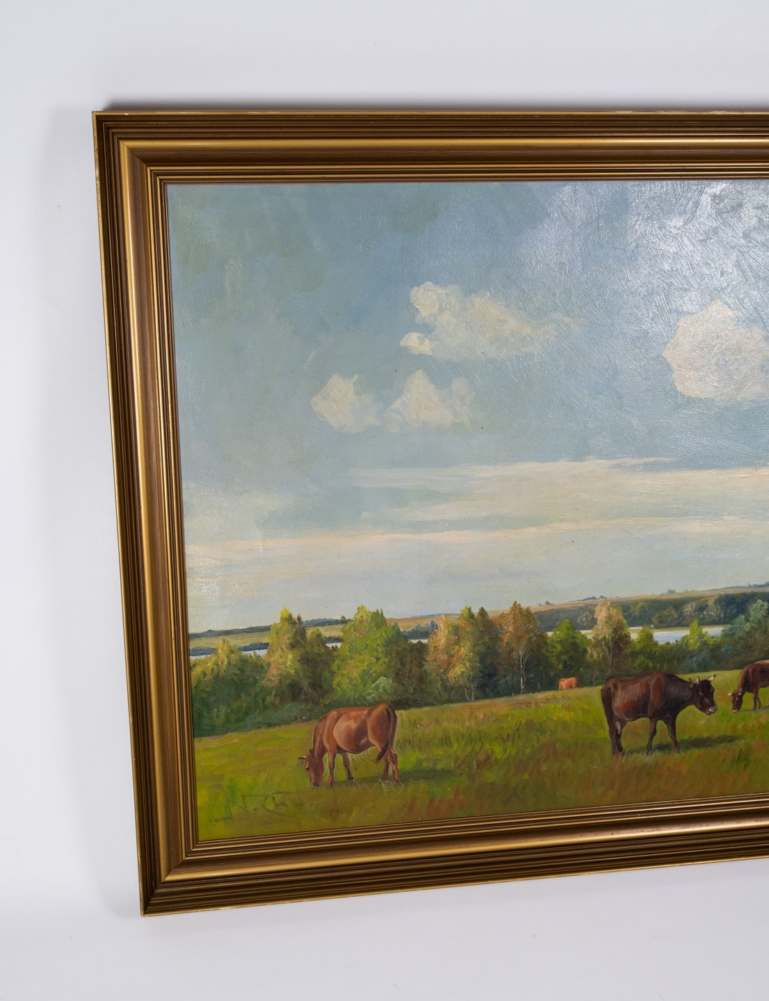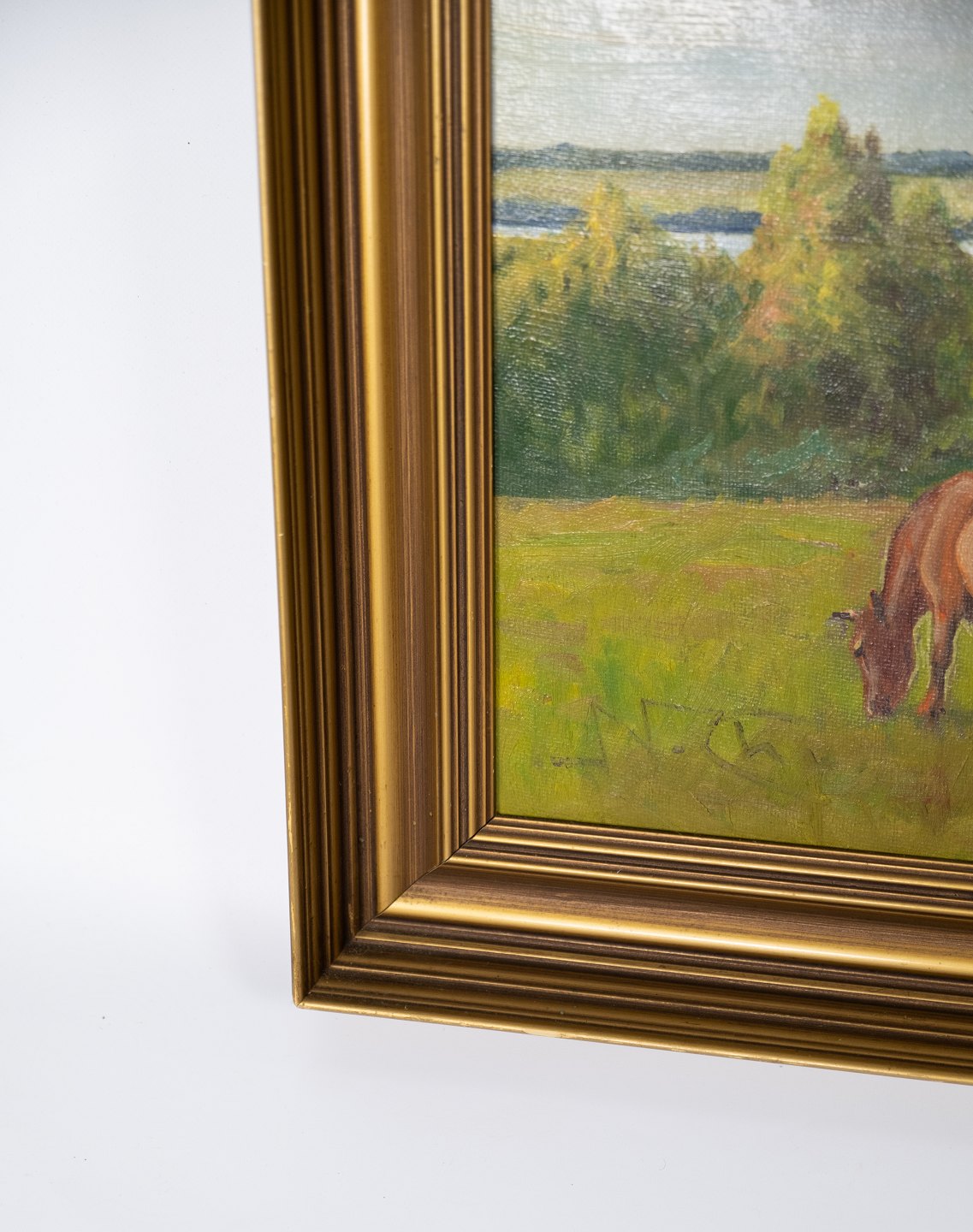 Oliemaleri med land motiv og forgyldt ramme, af Niels Christiansen.