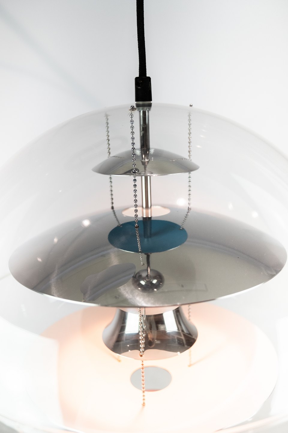 Globe, 40, designed by Verner Panton in 1969. The lamp is a transparent acrylic globe with 5 hanging metal reflectors, which is lacquered in White, blue and red.