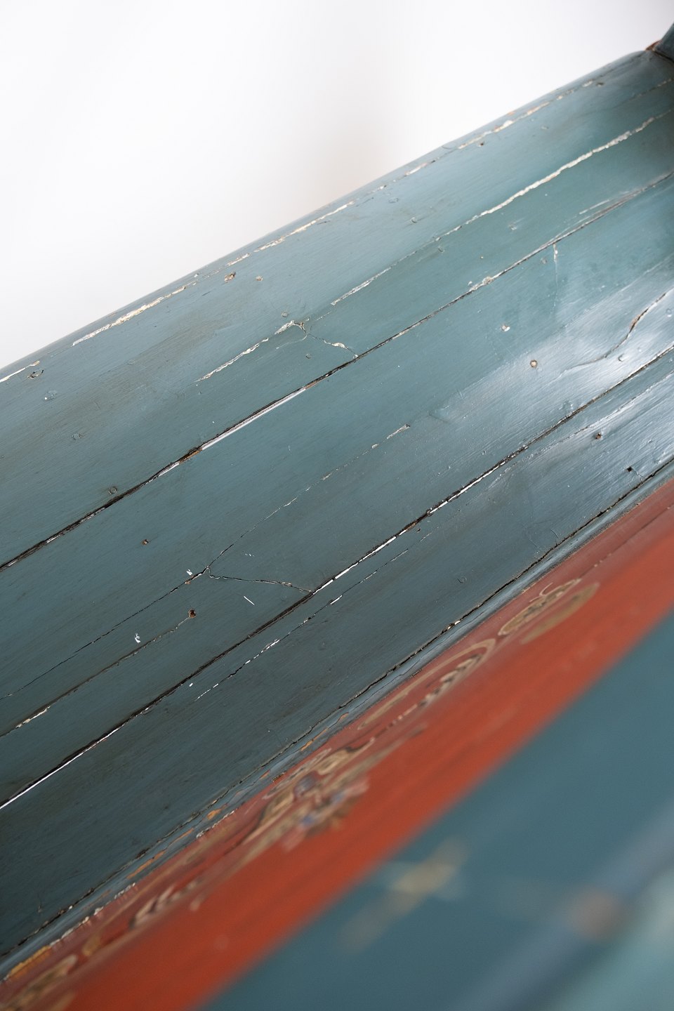 Painted bench in turqouise and red colors, and in great antique condition from the 1860s.