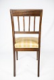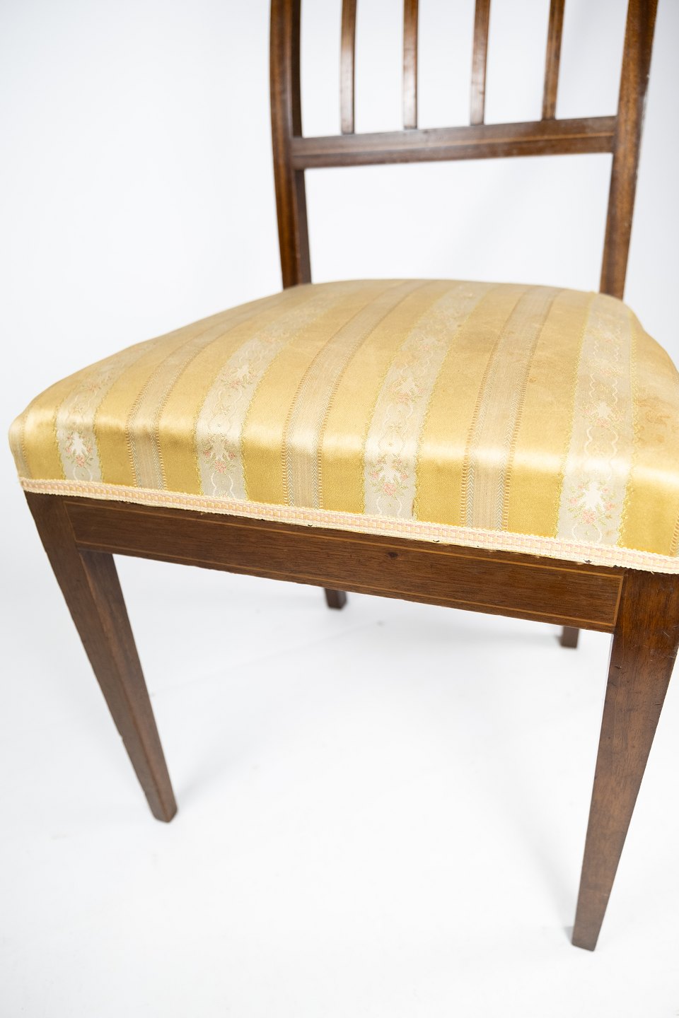 A pair of dining room chairs of mahogany with inlaid wood upholstered with light fabric from the 1920s.