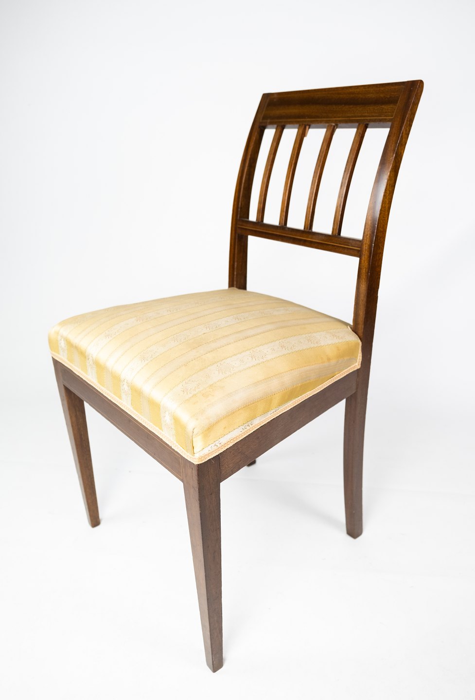 A pair of dining room chairs of mahogany with inlaid wood upholstered with light fabric from the 1920s. The chairs are in great vintage condition.