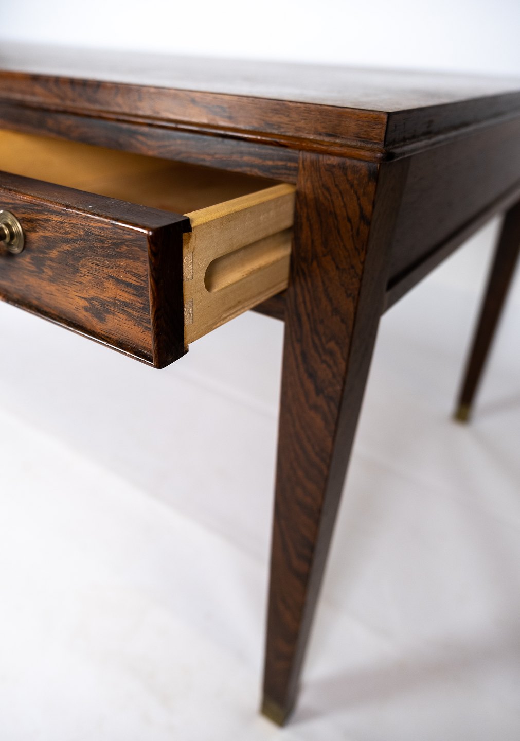 The table is made of rosewood, a wood known for its rich, deep colors and beautiful grain patterns. The natural beauty of rosewood makes each table unique and adds a touch of luxury to any room. The table's design is characterized by clean lines and a minimalist shape, giving it a timeless look that can be integrated into both modern and classic interiors.
