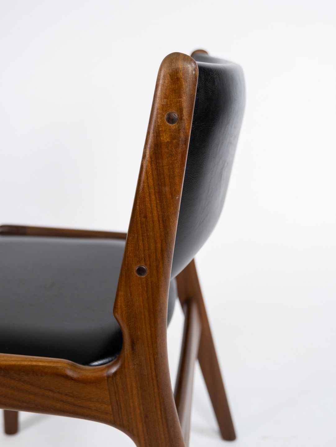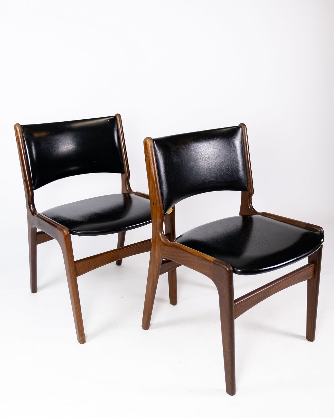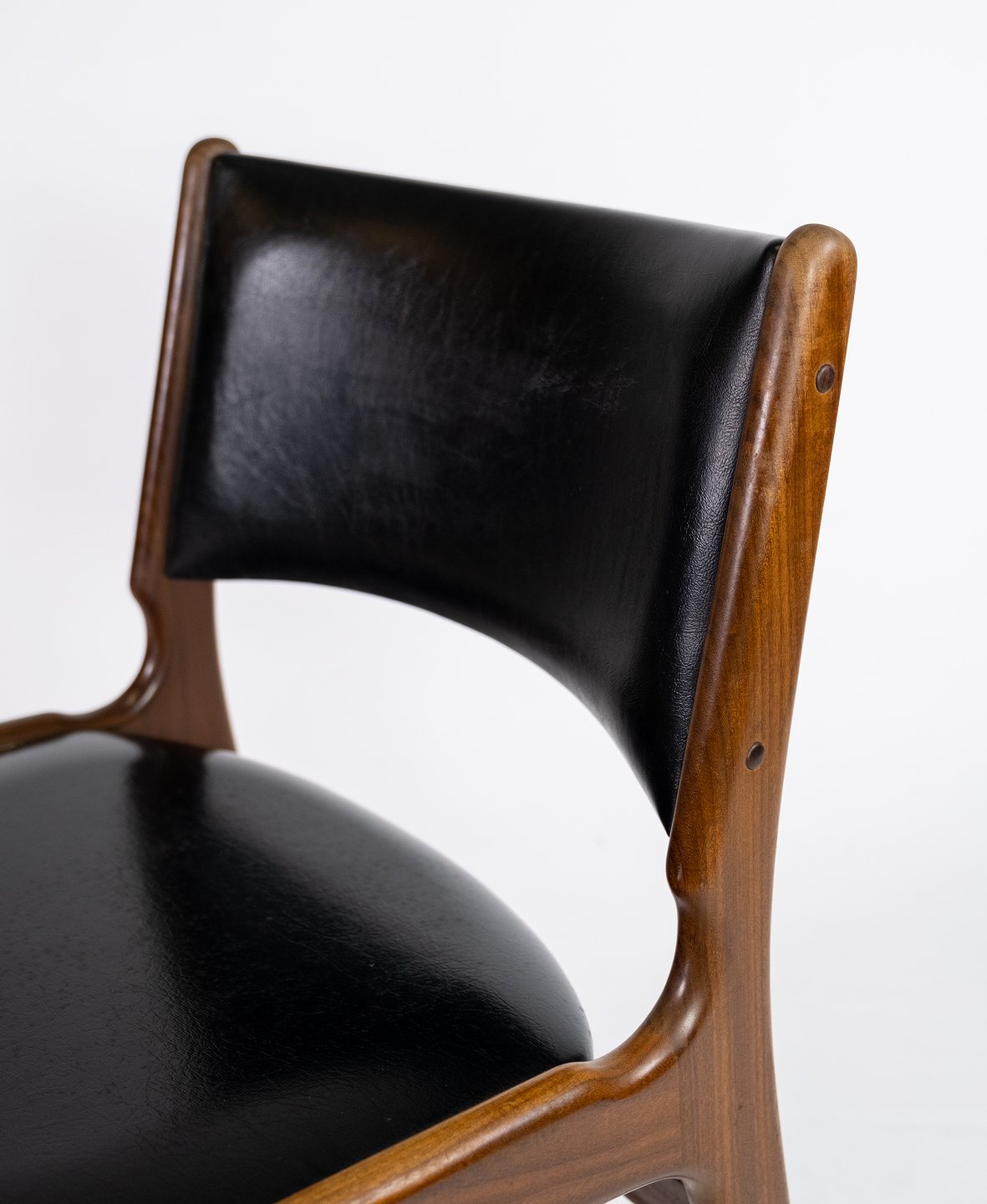 SolgtEt sæt stole i teak og med sort læder, designet af Erik Buch i 1960'erne, udstråler en tidløs elegance og funktionalitet. Disse stole er et smukt eksempel på dansk møbeldesign fra midten af det 20. århundrede og vil tilføre enhver indretning en sublim atmosfære.