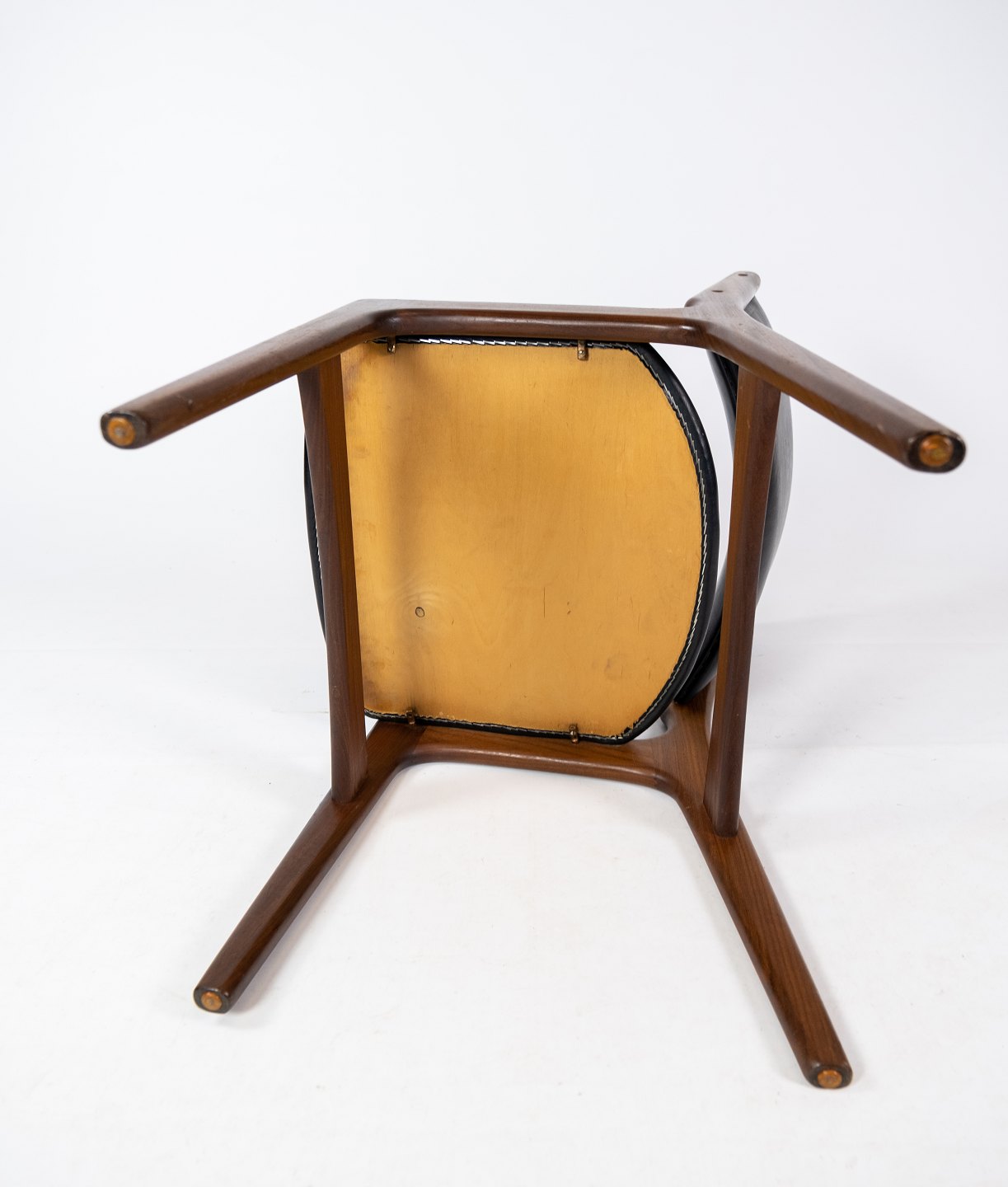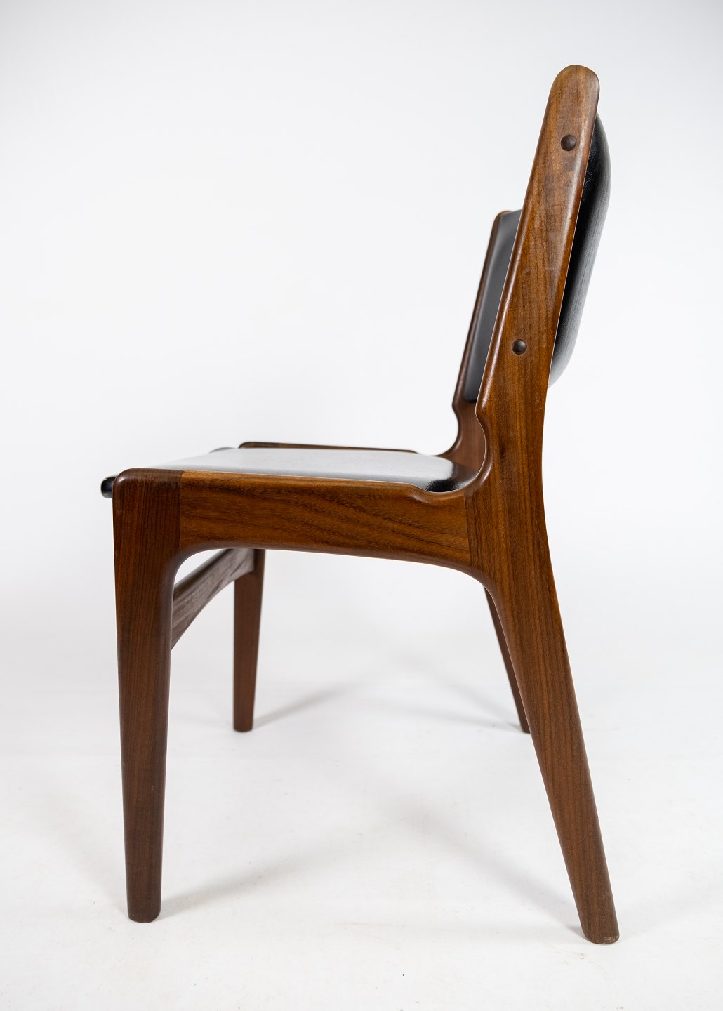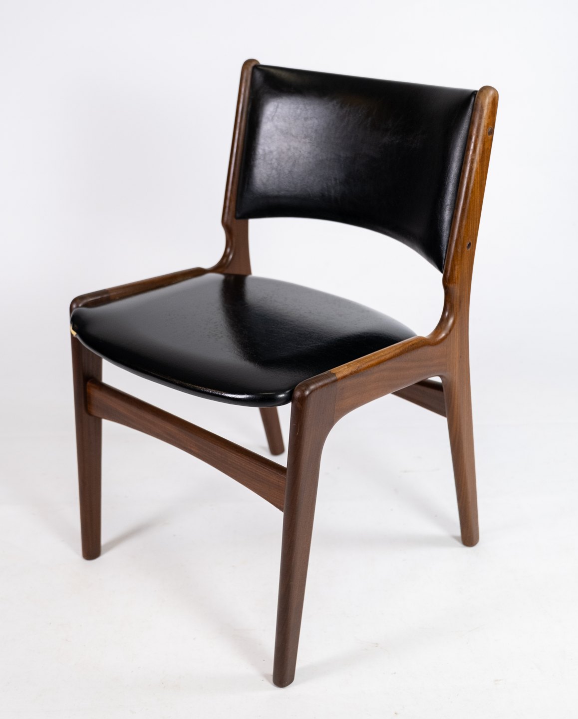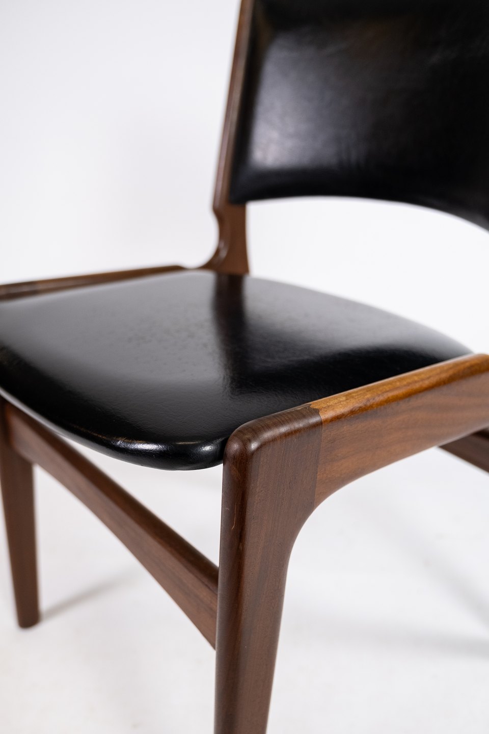 SolgtEt sæt stole i teak og med sort læder, designet af Erik Buch i 1960'erne, udstråler en tidløs elegance og funktionalitet. Disse stole er et smukt eksempel på dansk møbeldesign fra midten af det 20. århundrede og vil tilføre enhver indretning en sublim atmosfære.