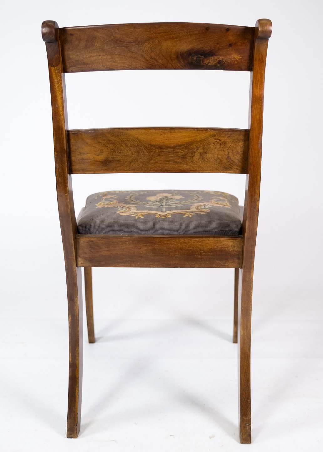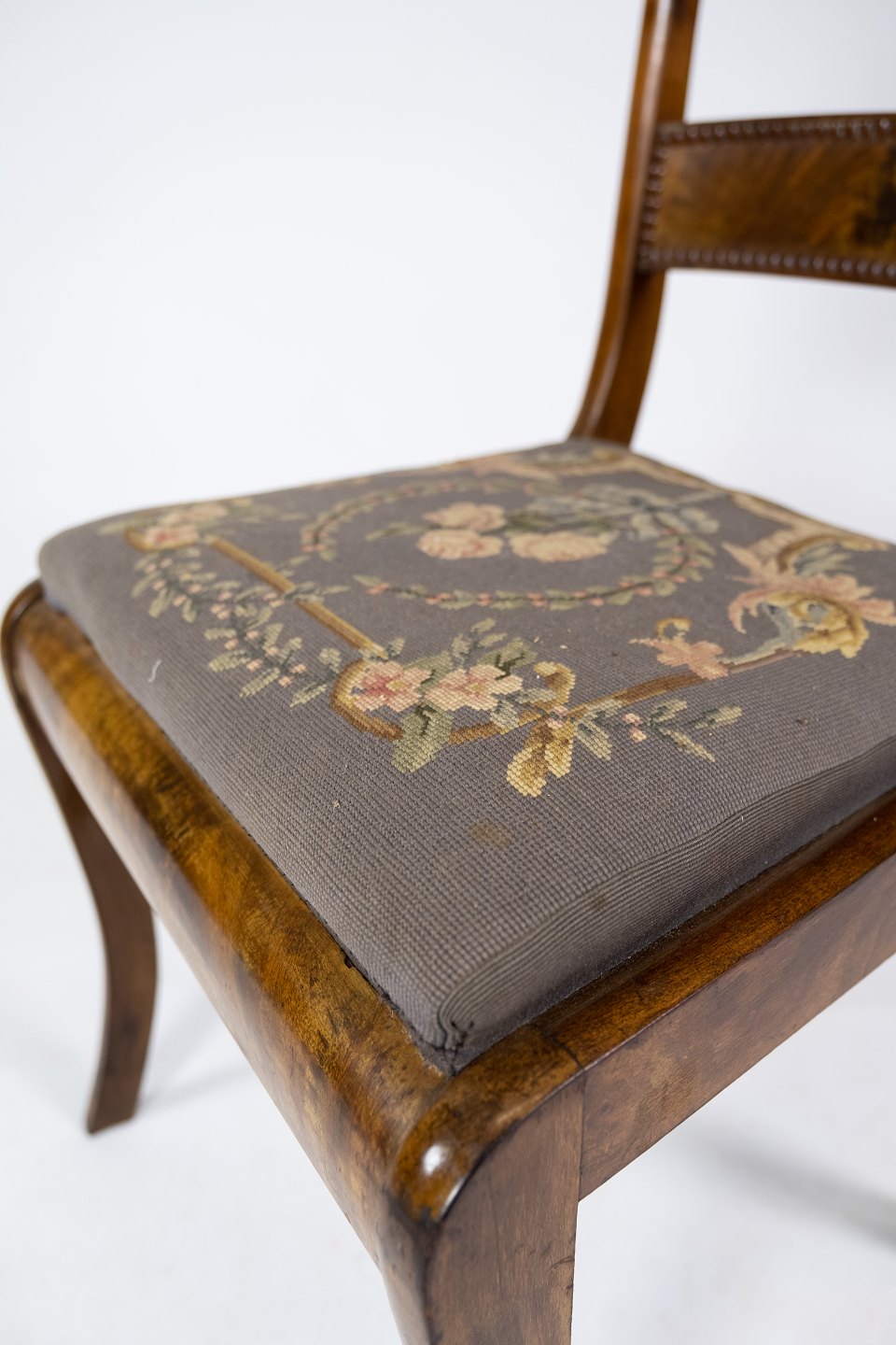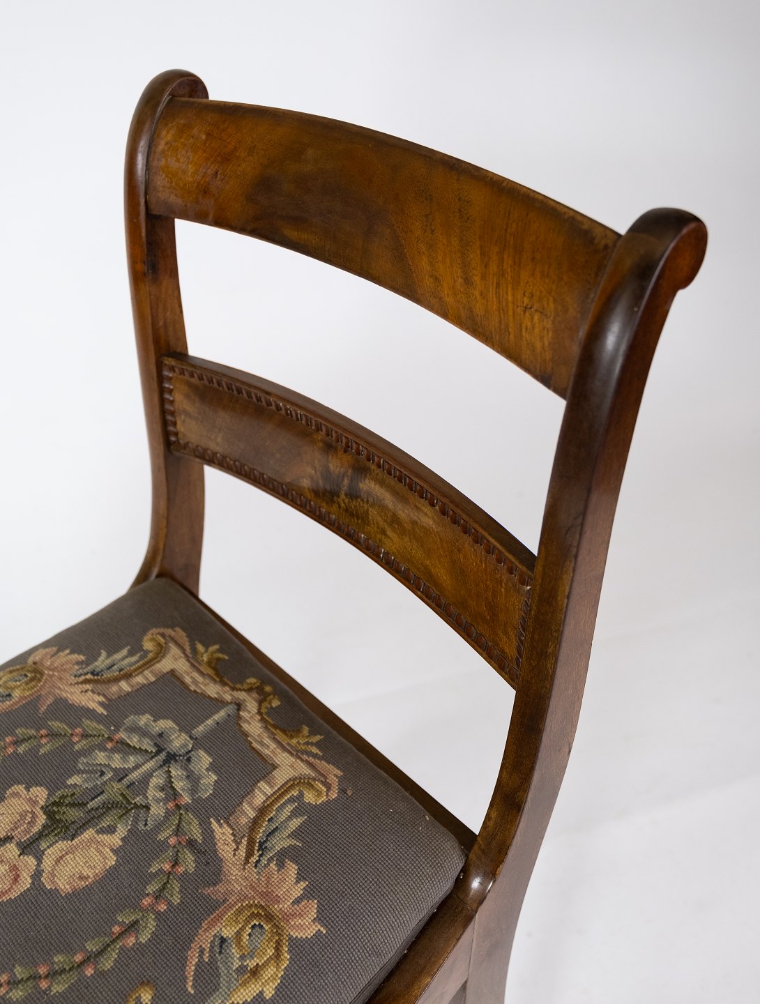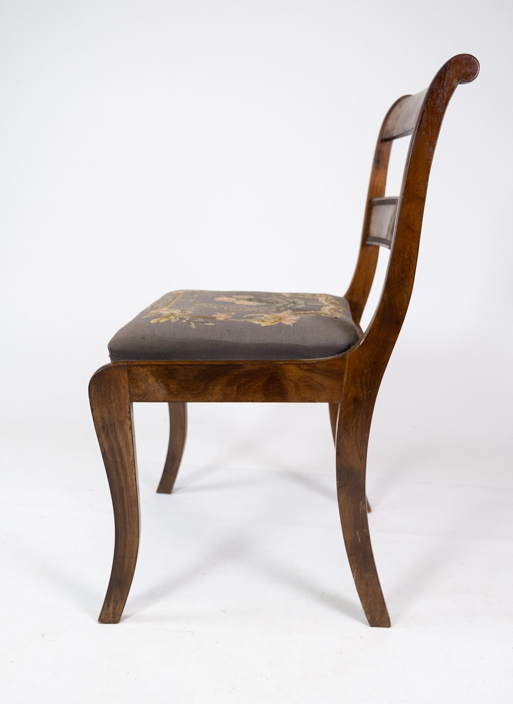 Salonstol af mahogni polstret med blomstret stof fra 1840erne.