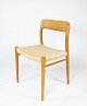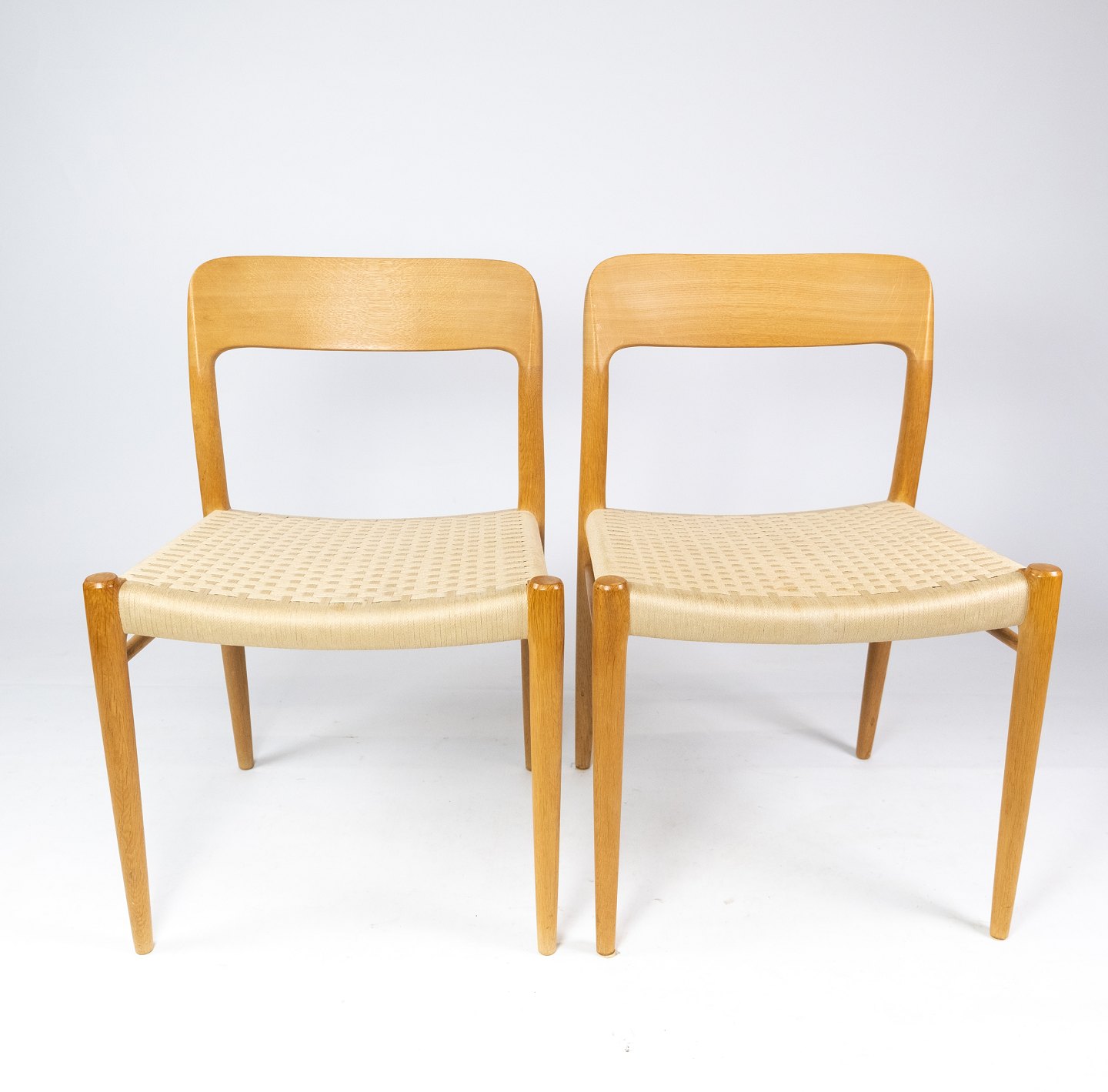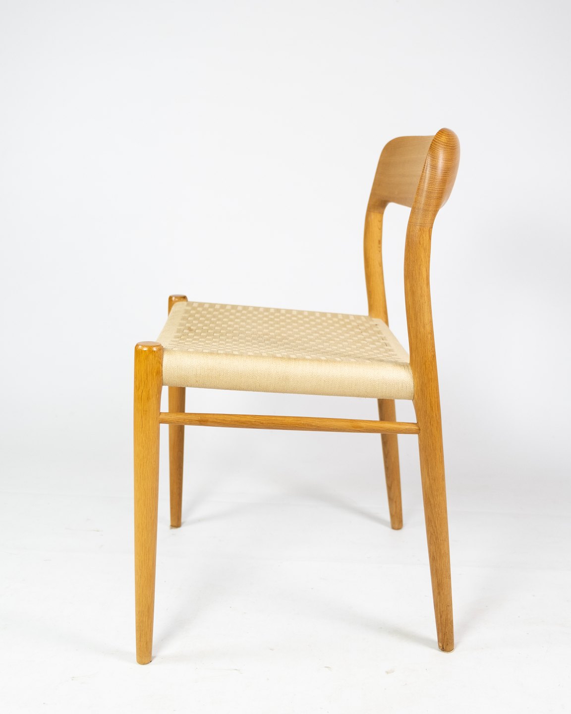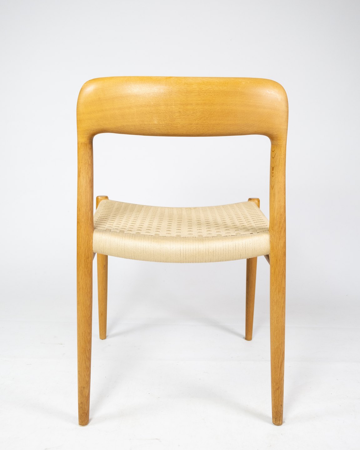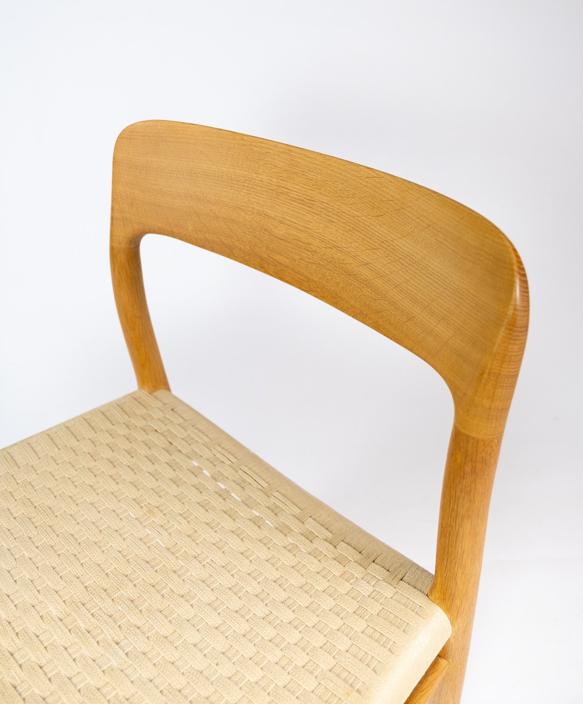 A set of four dining chairs, model 75, in oak and paper wicker, designed by N.O. Møller from the 1960s, represents a beautiful era in Danish furniture design. These chairs exude a timeless elegance and simplicity that will add a touch of Scandinavian charm to any dining room.