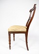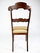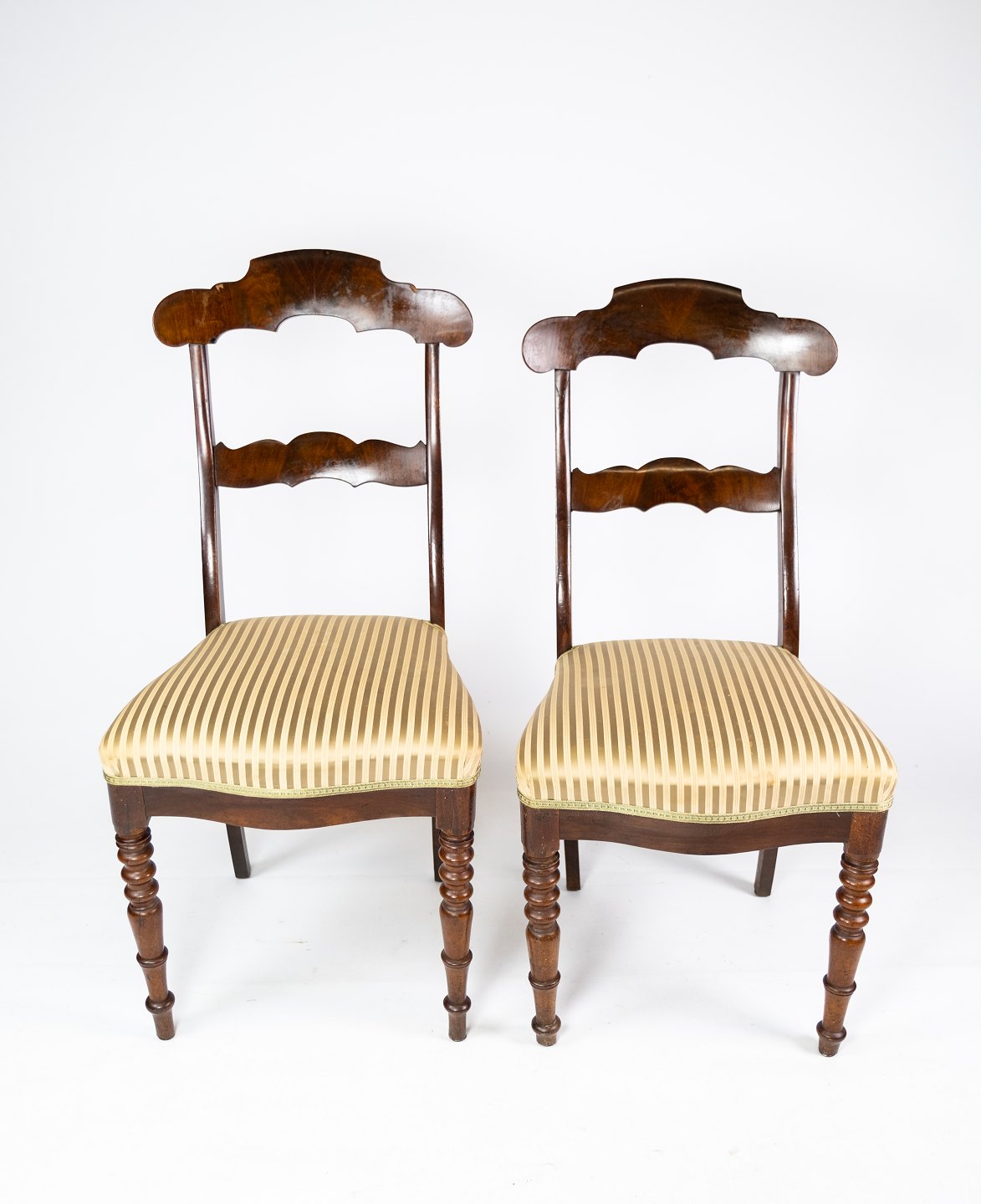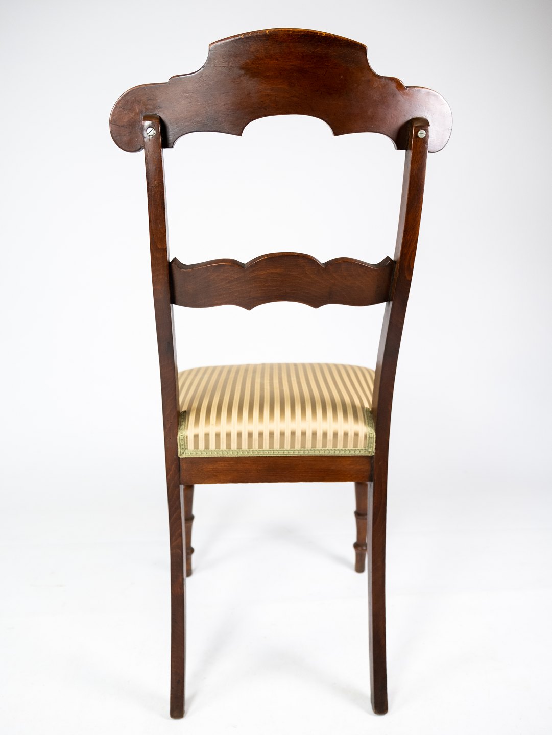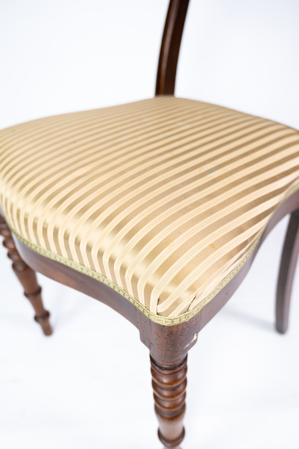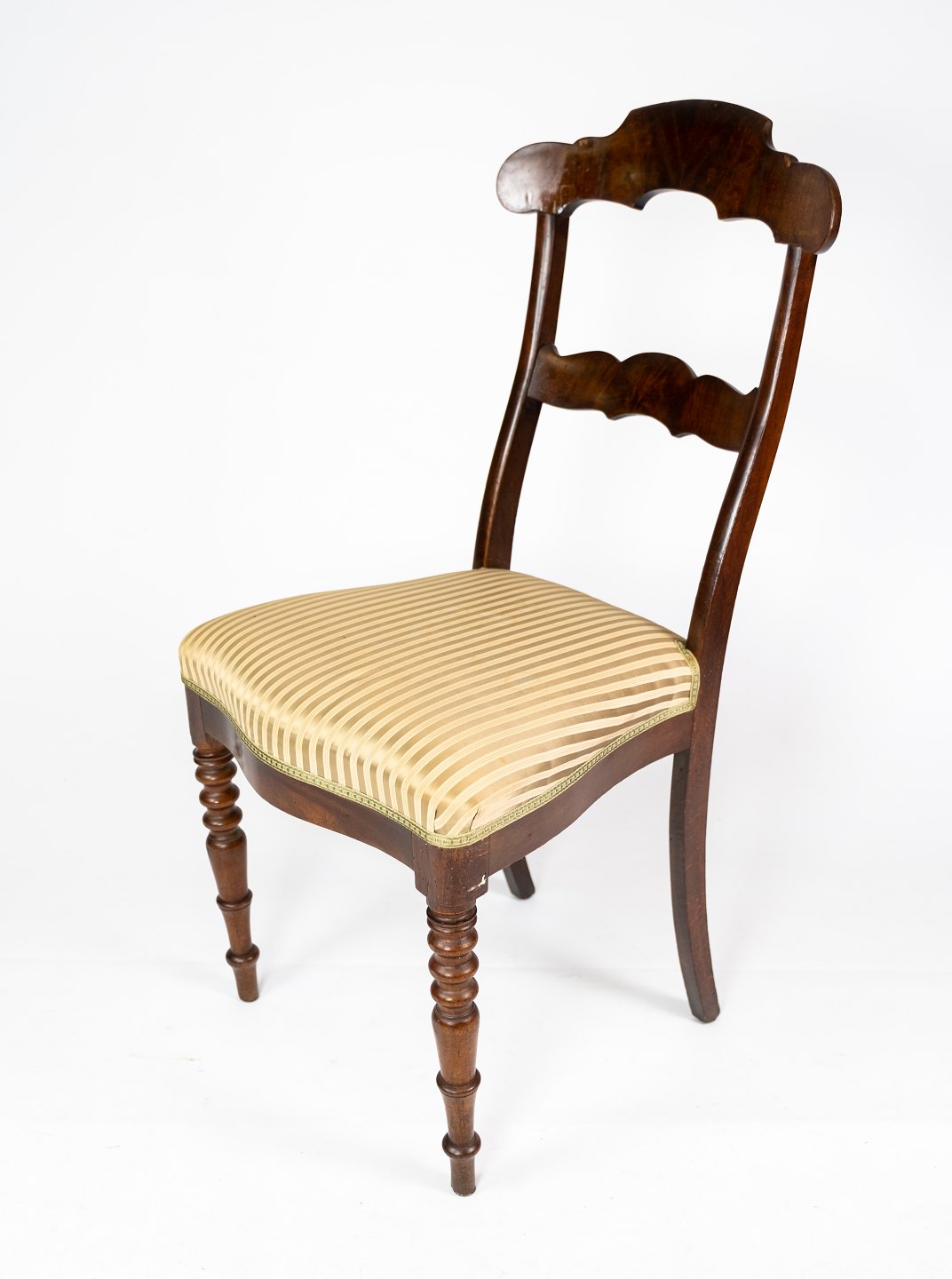A set of dining room chairs of mahogany and upholstered with striped fabric from the 1860s. The chairs are in great vintage condition.