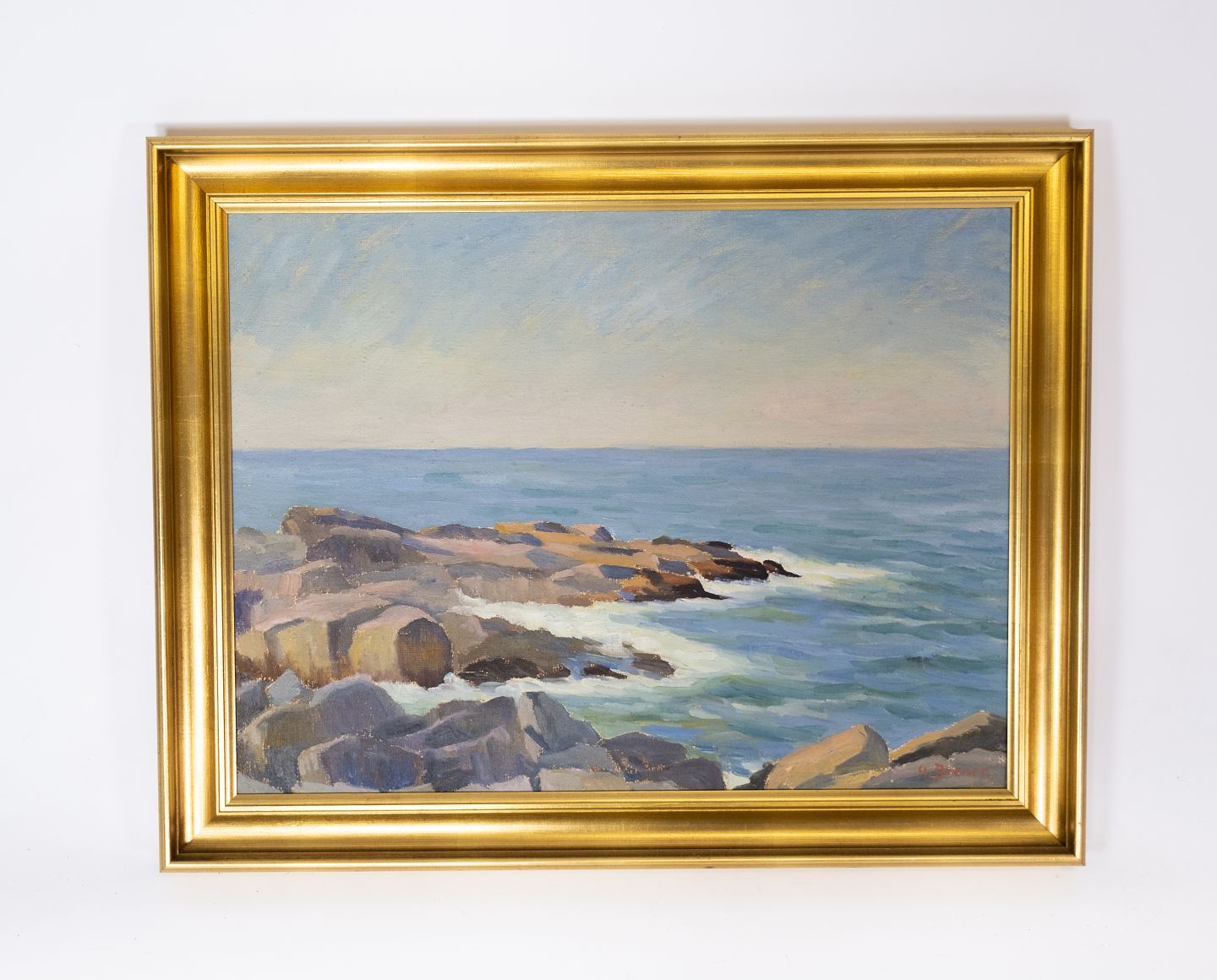 SoldOil painting with beach motif and gilded frame, signed Brener by Arthur Brener 1886-1956.