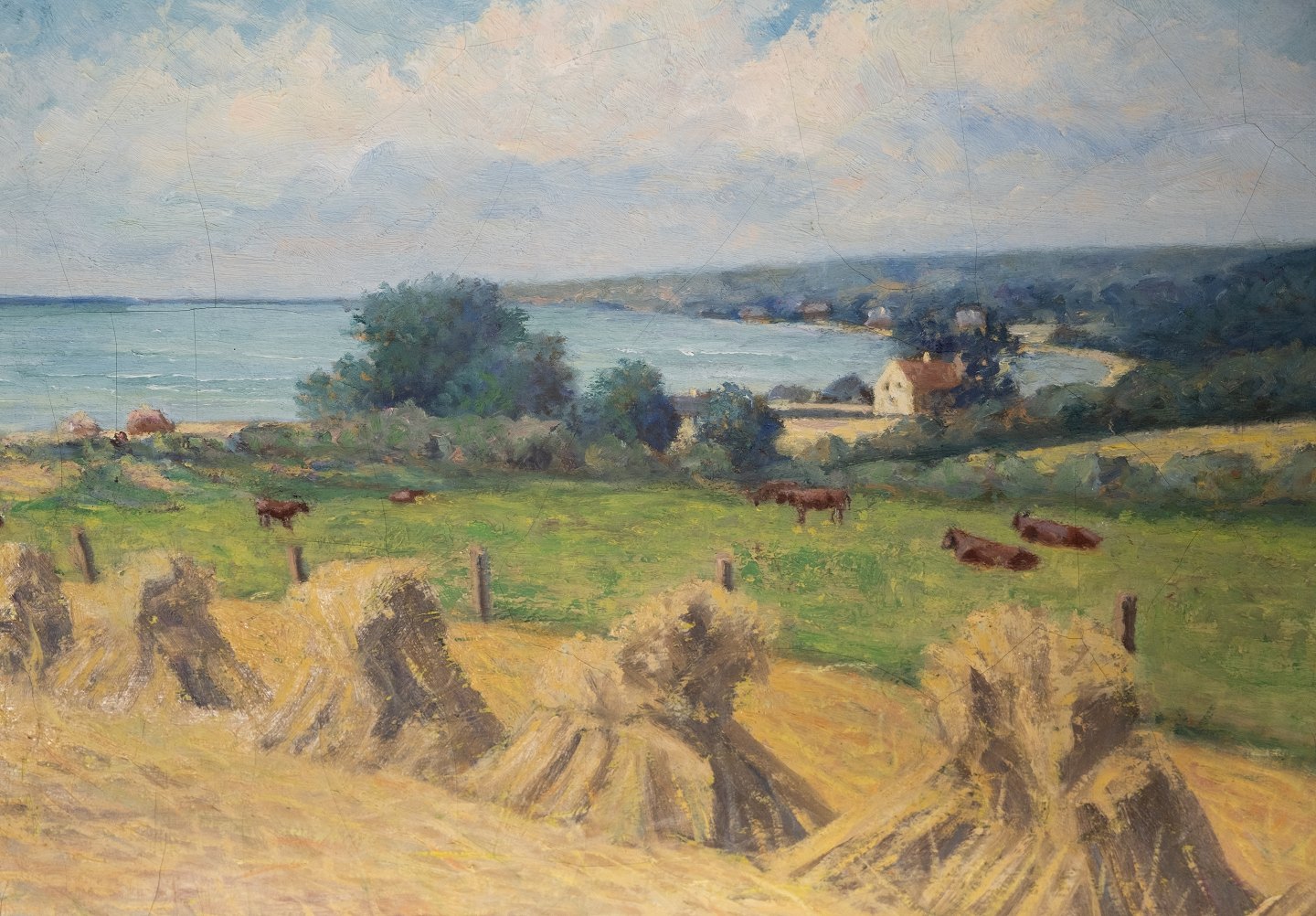 Oil painting with country motif and gilded frame, signed A. Toftlind 1950.