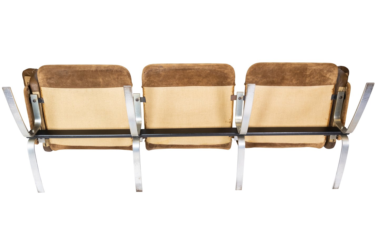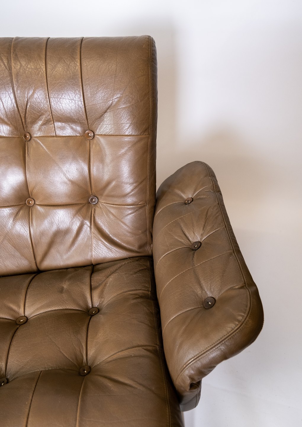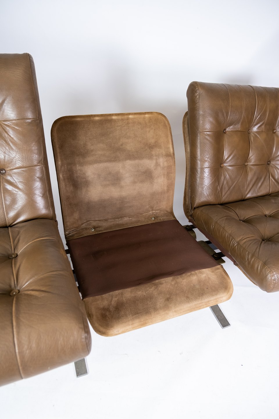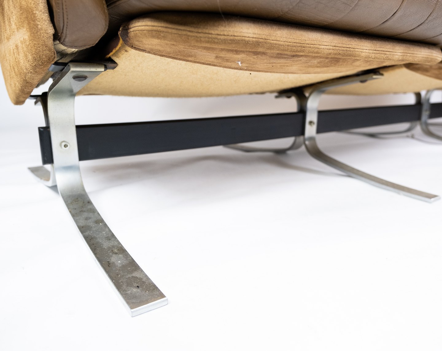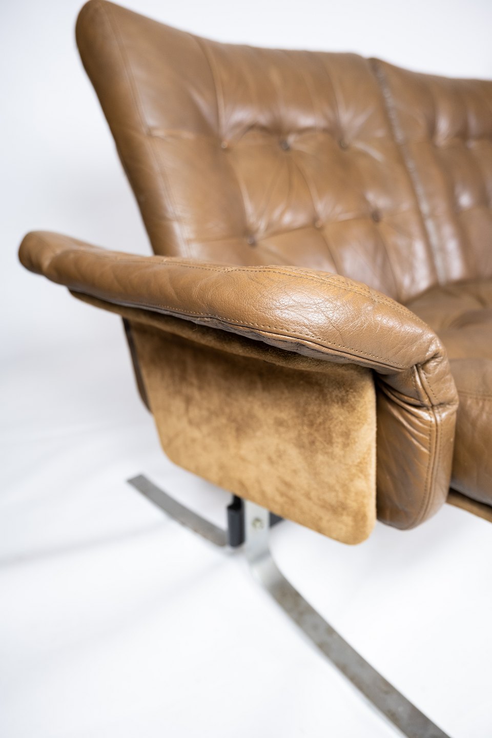 SoldThree seater sofa upholstered with light brown leather and frame in metal, of danish design from the 1970s. The sofa is in great vintage condition.