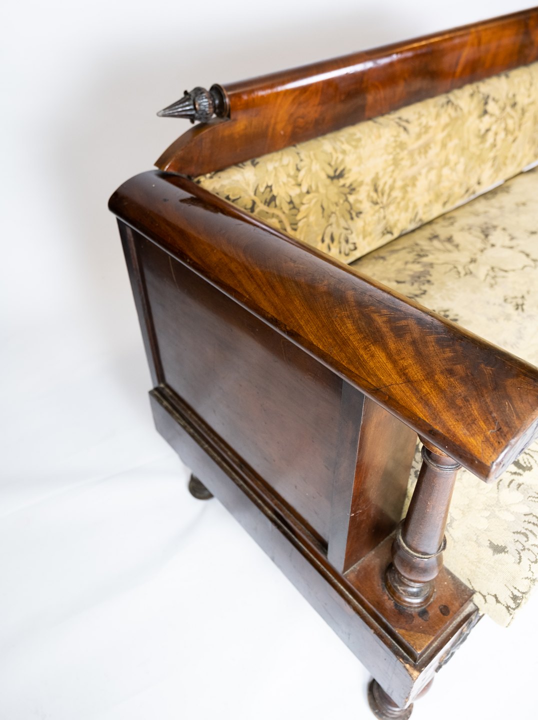 Late Empire sofa of mahogany and upholstered with light fabric, in great antique condition from the 1840s.