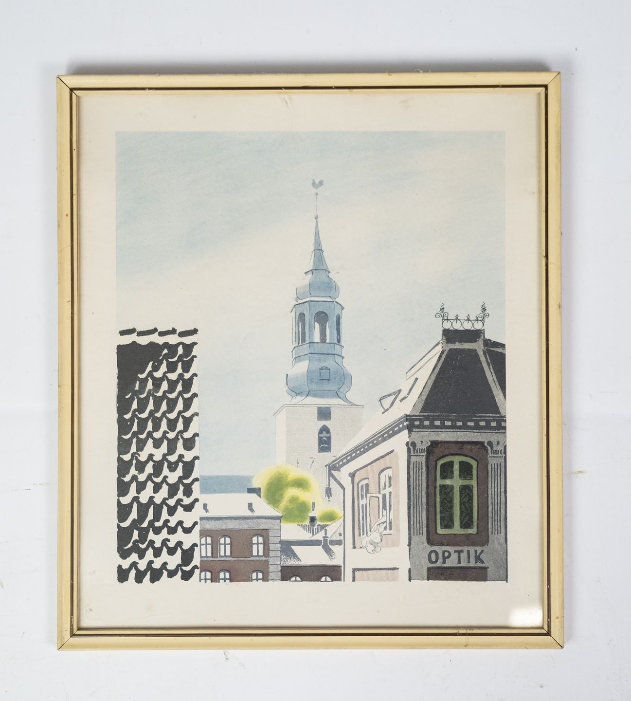 Print with city motif and gilded frame.
