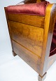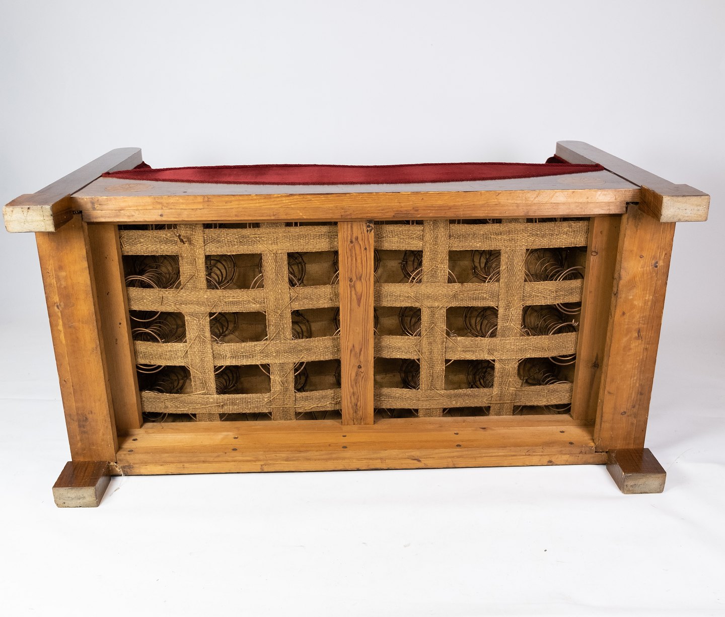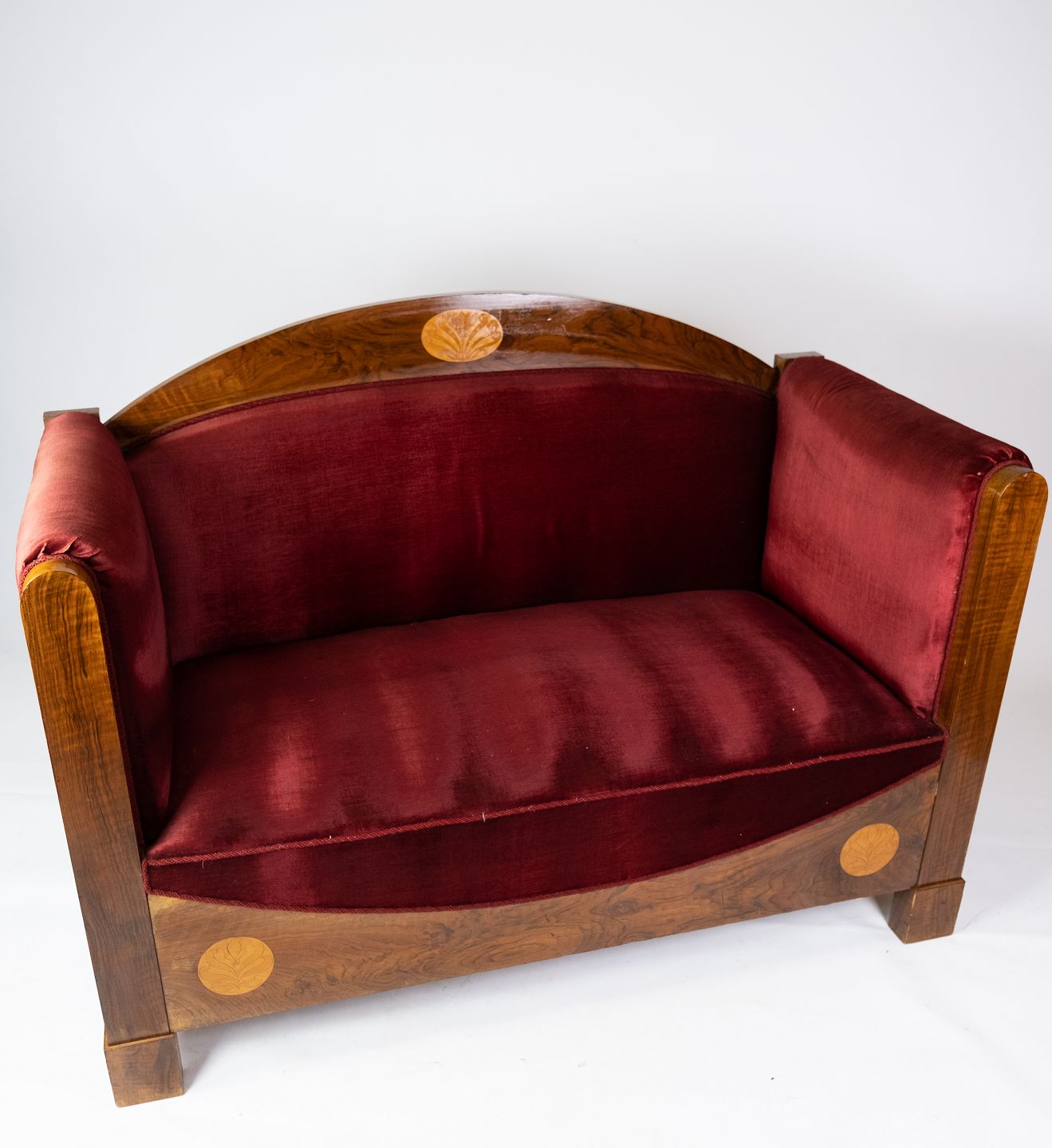 Two seater sofa of walnut with inlaid wood and upholstered with red velvet from around 1910. The sofa is in great vintage condition.