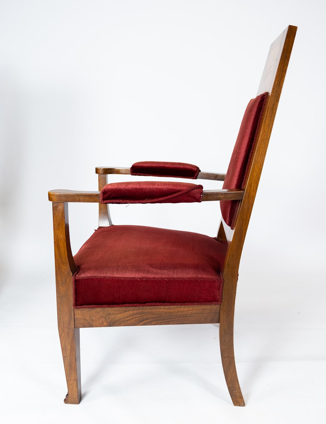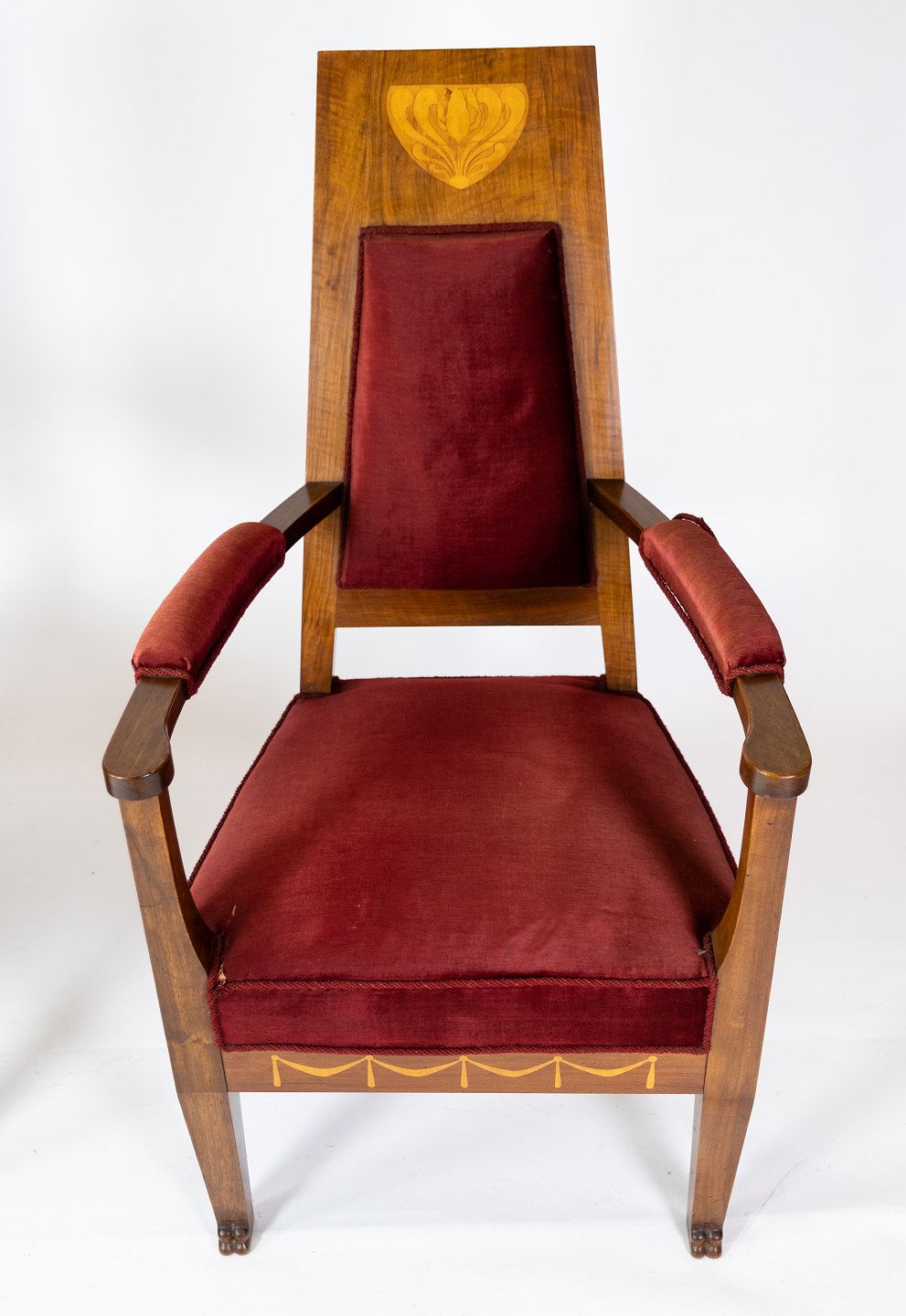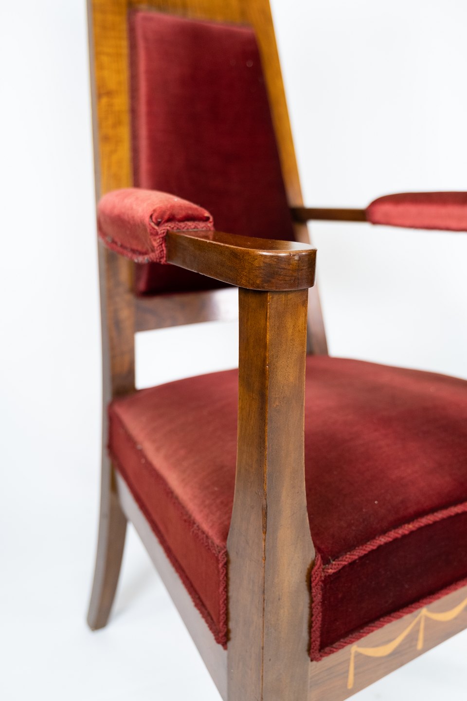 Set of two armchairs of walnut with inlaid wood and upholstered with red velvet from around 1910. The chairs are in great vintage condition.