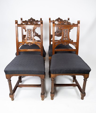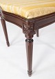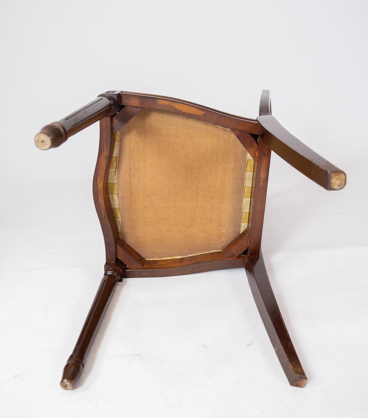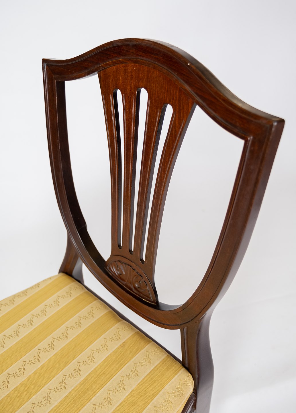 A set of dining room chairs of mahogany and upholstered with striped fabric from the 1920s. The chairs are in great vintage condition.