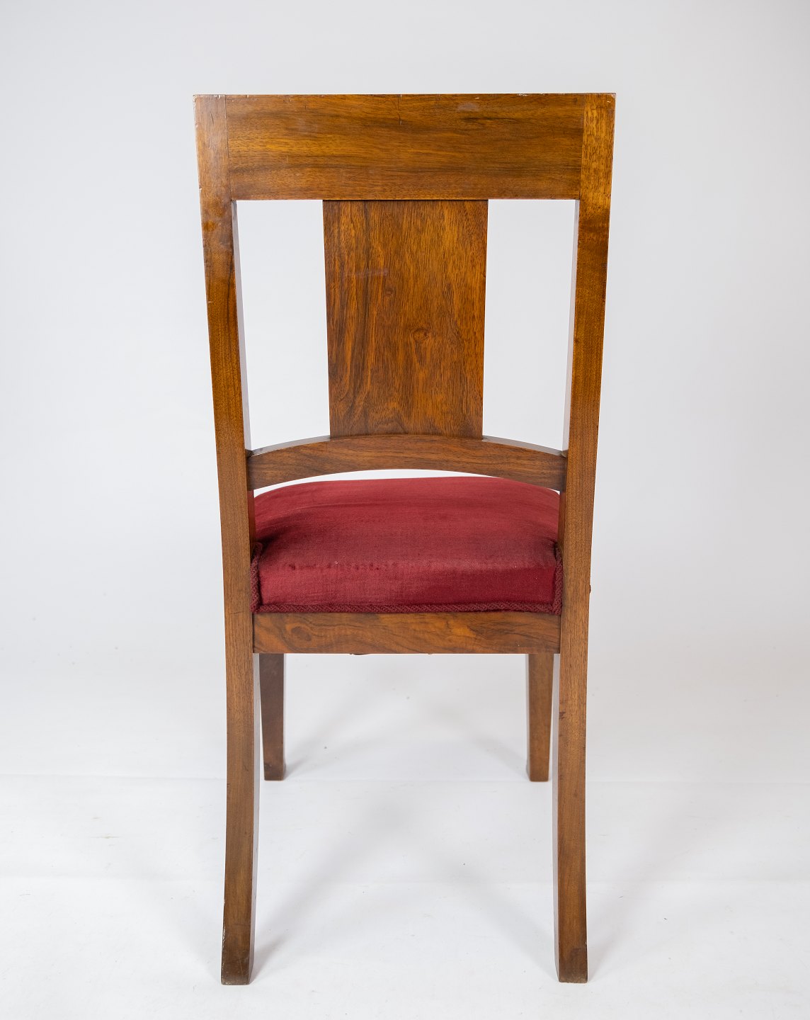 Set of four dining room chairs of walnut with inlaid wood and upholstered with red velvet from around 1910. The chairs are in great vintage condition.